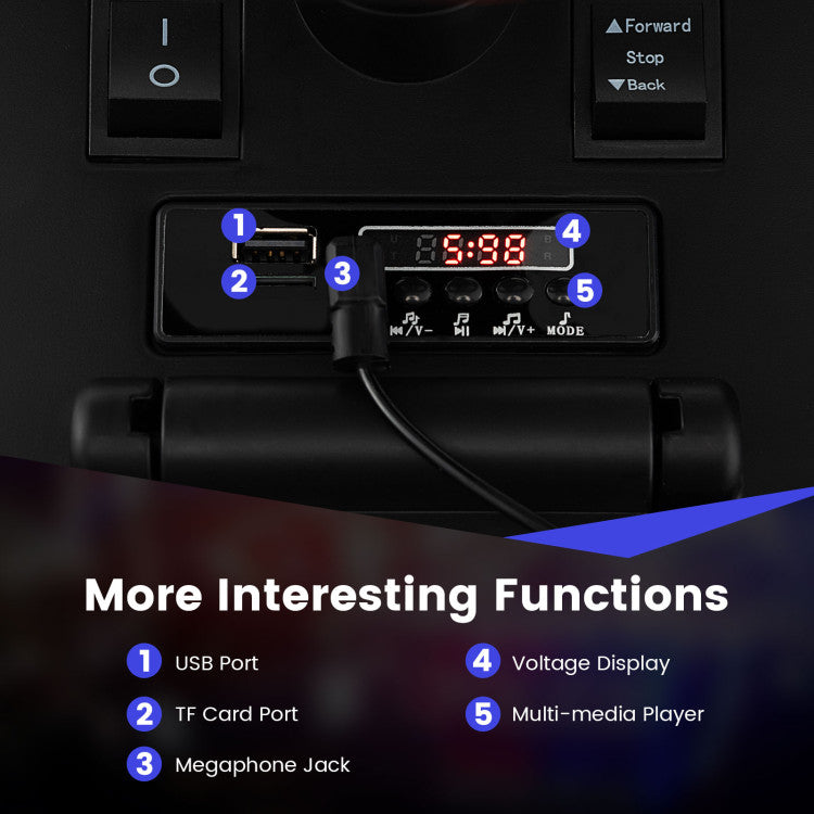 - Megaphone siren flashing lights and sound effects for a realistic driving experience- Built-in music external device interfaces and volume adjustment function- 4 wear-resistant and anti-slip wheels provide stable and smooth riding- Foot pedal and steering wheel help kids control the car with ease - Large compartment under the seat for convenient storage- Forward backward and stop functions by manual operation- ASTM certification and kid-friendly material ensure high quality - Bottom anti-tilt device and sturdy backrest for added security- 6V4AH rechargeable battery and 1.86 mph safe driving speedInstallation guide