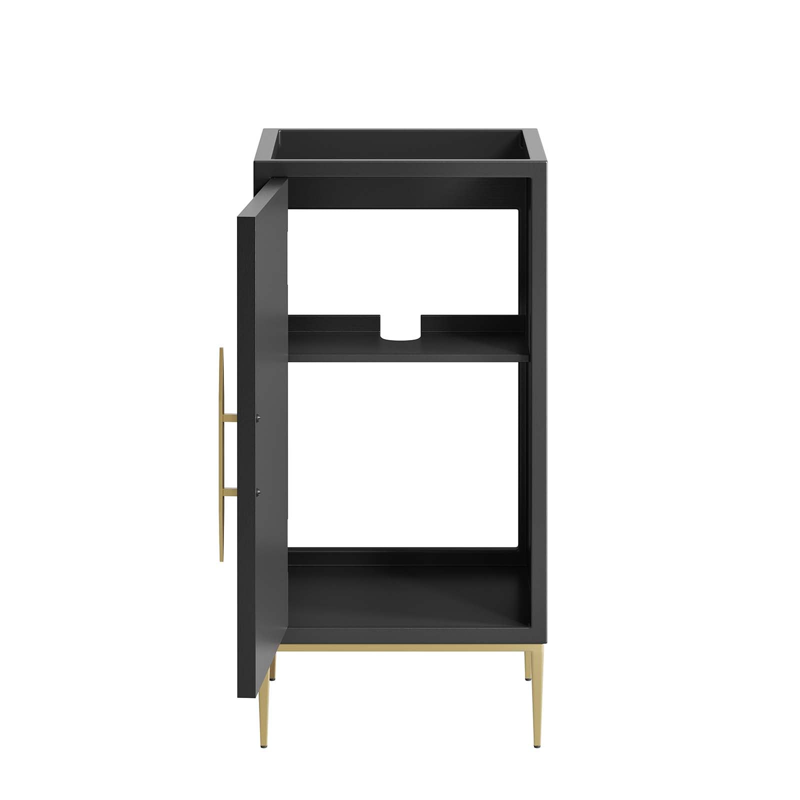 Intricate modernity radiates into your bathroom space with the Awaken 18" Bathroom Vanity Cabinet. Showcasing clean lines arranged in a radial formation, this bathroom vanity is crafted with solid wood and MDF and rests on a gold base with non-marking foot pads to protect flooring. Offering ample storage space for bathroom essentials and more, this vanity cabinet features spacious shelves hidden behind a detailed door with sleek gold hardware. Sink basin and fixtures not included. Assembly required. Set Includes: One - Awaken 18" Bathroom Vanity Cabinet