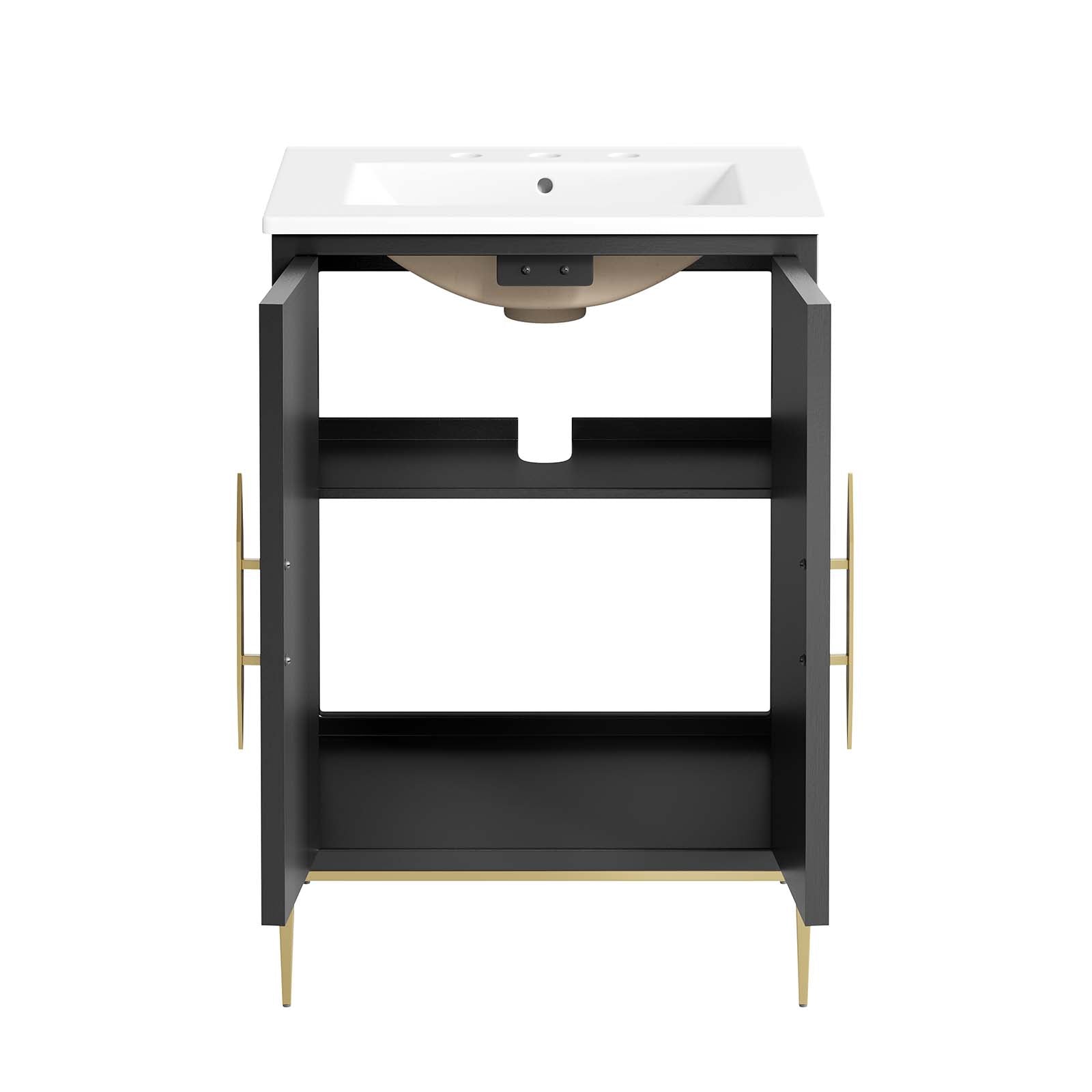 Intricate modernity radiates into your bathroom space with the Awaken 24" Bathroom Vanity. Showcasing clean lines arranged in a radial formation, this bathroom vanity is crafted with solid wood and MDF and rests on a gold base with non-marking foot pads to protect flooring. This vanity is a complete addition to a bathroom with a ceramic sink basin with an integrated countertop and 8" centerset holes. Offering ample storage space for bathroom essentials and more, this vanity cabinet features spacious shelves hidden behind detailed doors with sleek gold hardware. Fixtures not included. Assembly required. Set Includes: One - Awaken 24" Bathroom Vanity