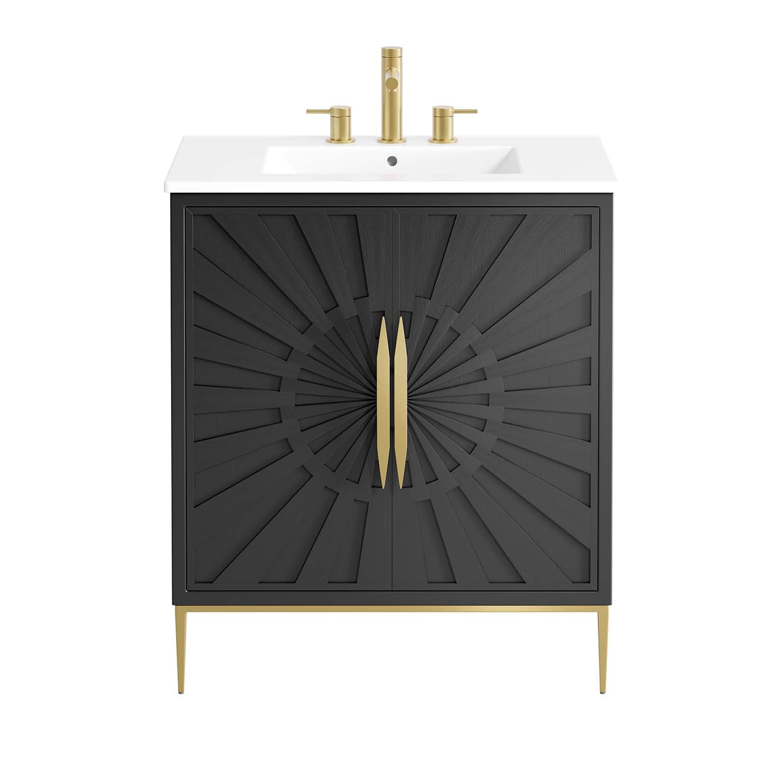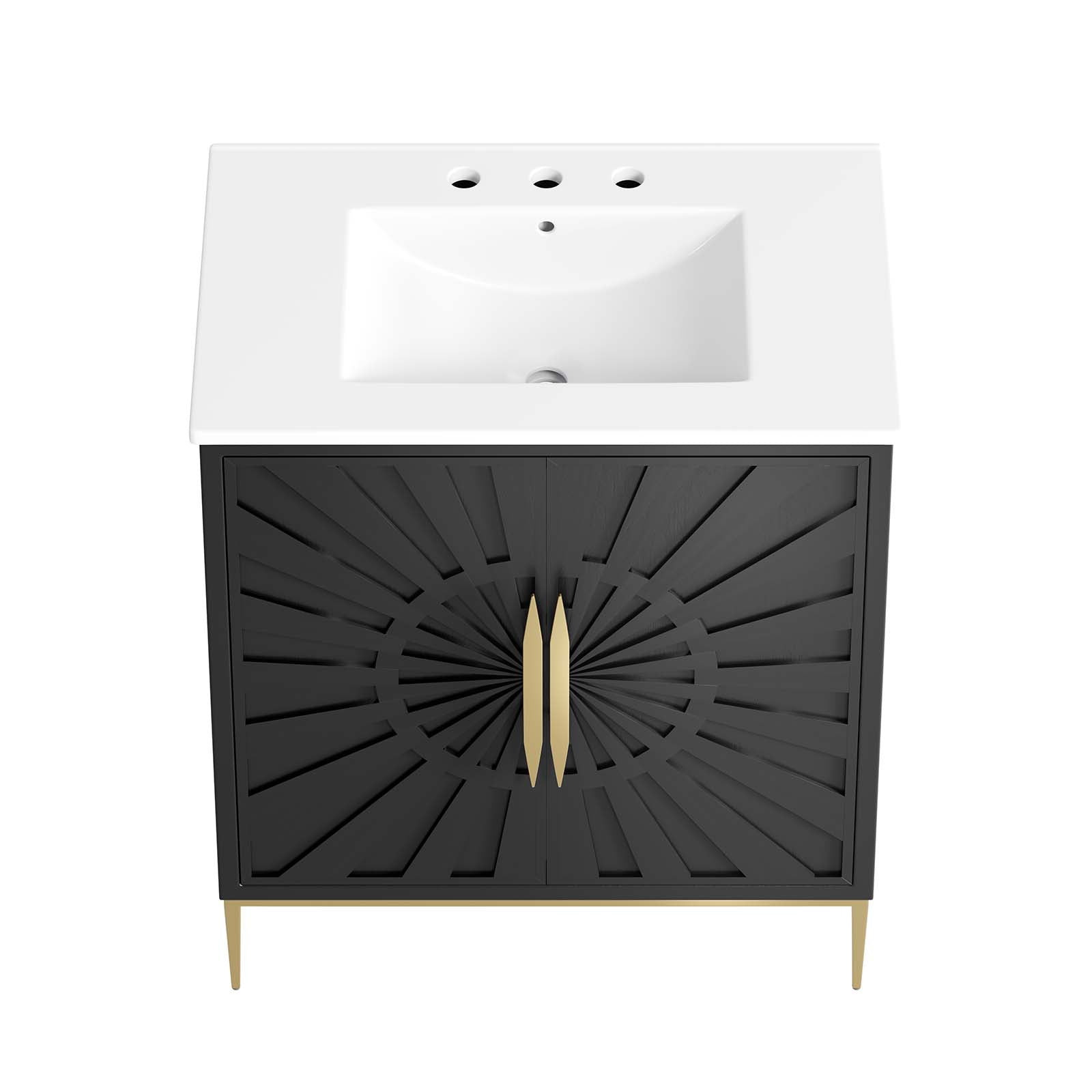 Intricate modernity radiates into your bathroom space with the Awaken 30" Bathroom Vanity. Showcasing clean lines arranged in a radial formation, this bathroom vanity is crafted with solid wood and MDF and rests on a gold base with non-marking foot pads to protect flooring. This vanity is a complete addition to a bathroom with a ceramic sink basin with an integrated countertop and 8" centerset holes. Offering ample storage space for bathroom essentials and more, this vanity cabinet features spacious shelves hidden behind detailed doors with sleek gold hardware. Fixtures not included. Assembly required. Set Includes: One - Awaken 30" Bathroom Vanity