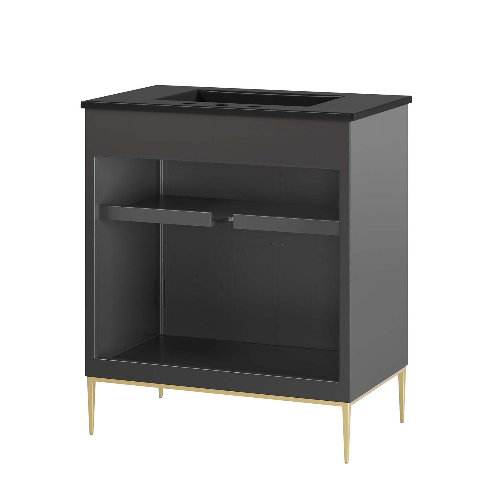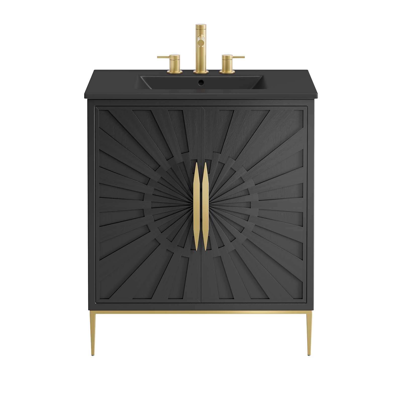 Intricate modernity radiates into your bathroom space with the Awaken 30" Bathroom Vanity. Showcasing clean lines arranged in a radial formation, this bathroom vanity is crafted with solid wood and MDF and rests on a gold base with non-marking foot pads to protect flooring. This vanity is a complete addition to a bathroom with a ceramic sink basin with an integrated countertop and 8" centerset holes. Offering ample storage space for bathroom essentials and more, this vanity cabinet features spacious shelves hidden behind detailed doors with sleek gold hardware. Fixtures not included. Assembly required. Set Includes: One - Awaken 30" Bathroom Vanity