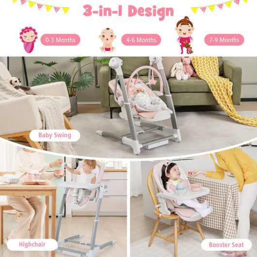 -Designed with 8 adjustable heights 5-position backrest(20° 30° 40° 50° 60° ) and 3-position adjustable footrest(0° 26° 58° ) -3-in-1 design meets baby's daily needs-15 lullabies 5 natural songs and 2 hanging toys to delight babies-8-level swing speed and 15/30/60 minutes timer to freely control the baby swing-Auto-open & close function for safe swinging -Removable tray for easy cleaning-Tray with 2 postions adjustment for different uses-Offers your baby comfortable seat with soft cushion-Pressing the folding button to fold it up for easy storage-Hidden wheels for easy movement-Protective baffle and 5-point safety belt protect kid's safety-Anti-slip foot pads for floor protection and extra sturdiness