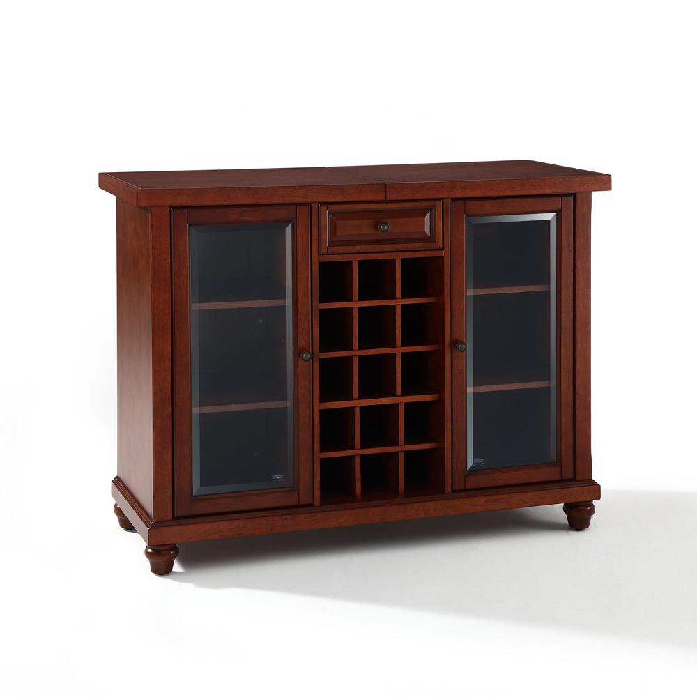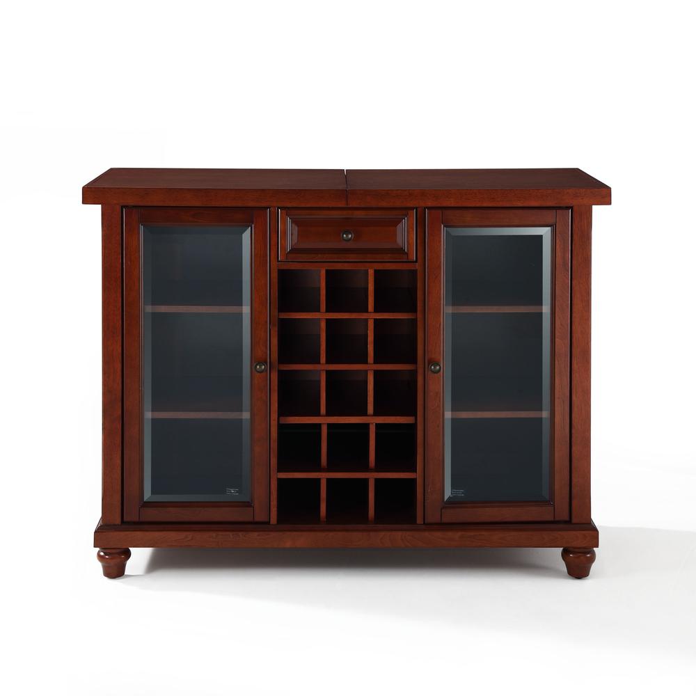 Elegantly entertain guests with the Cambridge Sliding Top Bar. Beautiful, beveled glass doors and turned feet add classic style, while the versatile sliding top provides extra serving space. Behind the glass doors, adjustable shelves offer plentiful storage space for spirits and barware. The removable center wine rack holds up to 15 bottles of wine. Make at home entertaining a breeze with the Cambridge Sliding Top Bar.