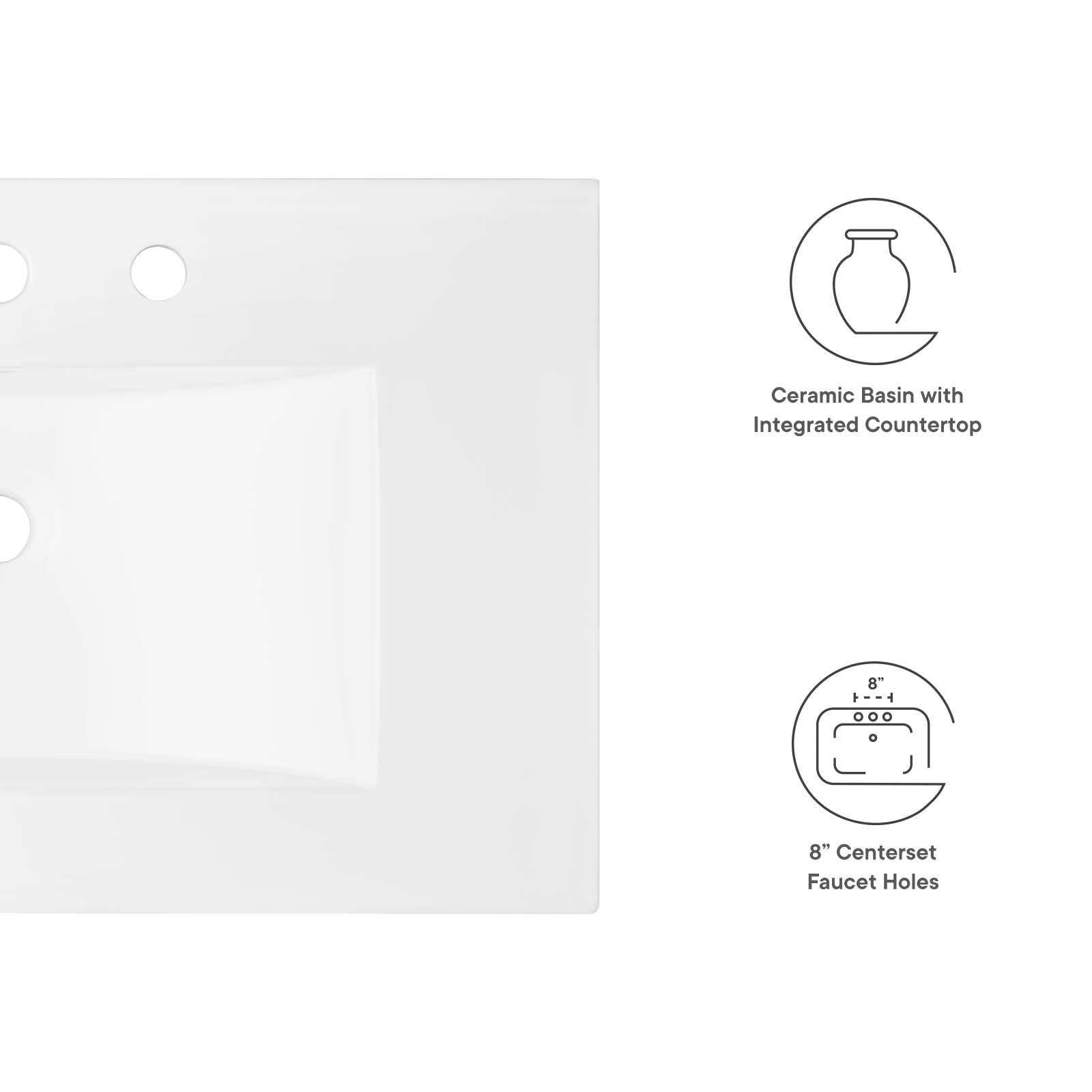 Wash, rinse, and brush in modern style with the Cayman 30" Sink. This ceramic sink boasts 8-inch centerset faucet holes, an integrated countertop, and a rectangular basin design, all coming together to create a modern and sophisticated look for your bathroom space. Elevate your daily routine with this contemporary sink that combines functionality and aesthetic appeal flawlessly. Set Includes: One - Cayman 30" Bathroom Sink