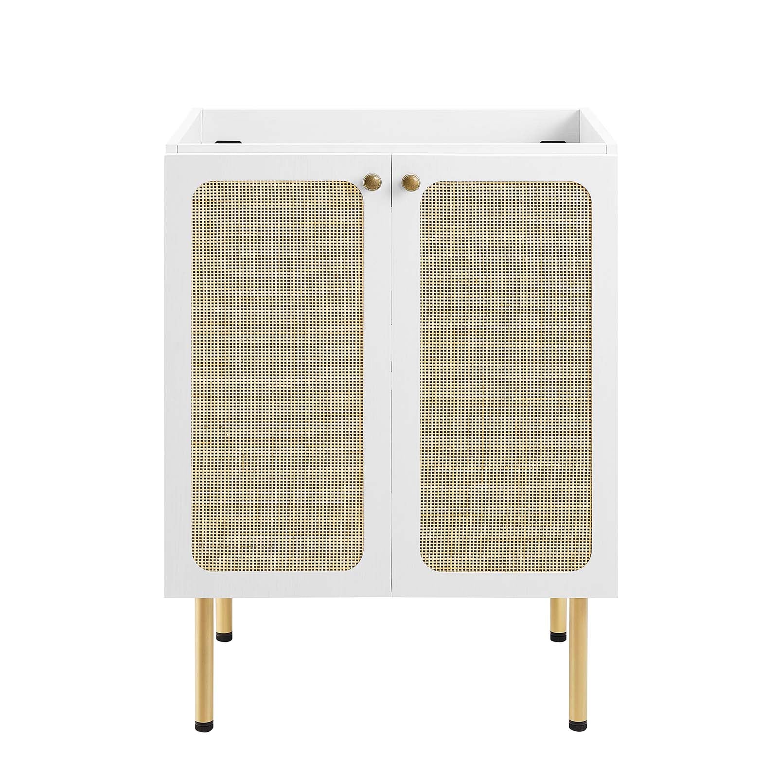 Refresh your washroom with the textured detail of the Chaucer 24" Bathroom Vanity. Featuring beautiful rattan weaving on its doors, this vanity cabinet instantly updates any bathroom or powder room. A spacious adjustable top shelf and a fixed bottom shelf hidden behind its hinged doors offers ample storage space for toiletries, towels, and other bathroom essentials. With a ceramic basin with 8" centerset holes and an integrated countertop, this vanityÕs design highlights its sleek countertop for an added touch of elegance. Enriched by stylish round metal cabinet knobs and resting on sleek legs with adjustable feet for added stability, this bathroom cabinet is durably crafted with MDF, particleboard, and wood grain laminate to bring natural organic aesthetics to your decor. Assembly required. Fixtures not included. Top Shelf Weight Capacity: 33 lbs. Bottom Shelf Weight Capacity: 66 lbs. Set Includes: One - Cayman 24" Bathroom Sink One - Chaucer 24" Bathroom Vanity Cabinet (Sink Basin Not Included)