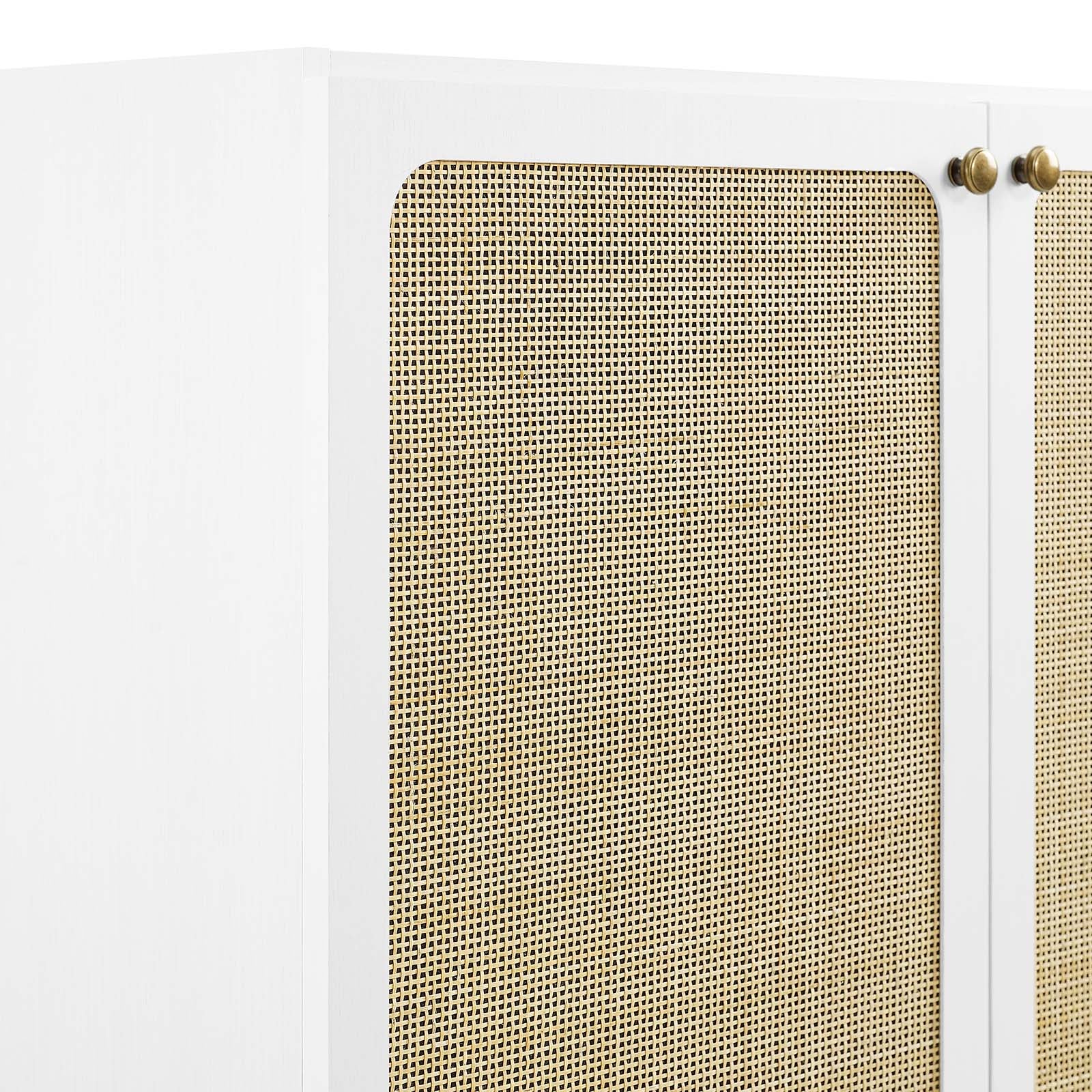 Refresh your washroom with the textured detail of the Chaucer 36" Bathroom Vanity Cabinet. Featuring beautiful rattan weaving on its doors, this vanity cabinet instantly updates any bathroom or powder room. A spacious adjustable top shelf and a fixed bottom shelf hidden behind its hinged doors offers ample storage space for toiletries, towels, and other bathroom essentials. Enriched by stylish round metal cabinet knobs and resting on sleek legs with adjustable feet for added stability, this bathroom cabinet is durably crafted with MDF, particleboard, and wood grain laminate to bring natural organic aesthetics to your decor. Assembly required. Fixtures and sink basin not included. Top Shelf Weight Capacity: 48 lbs. Bottom Shelf Weight Capacity: 99 lbs. Set Includes: One - Chaucer 36"Bathroom Vanity Cabinet (Sink Basin Not Included)