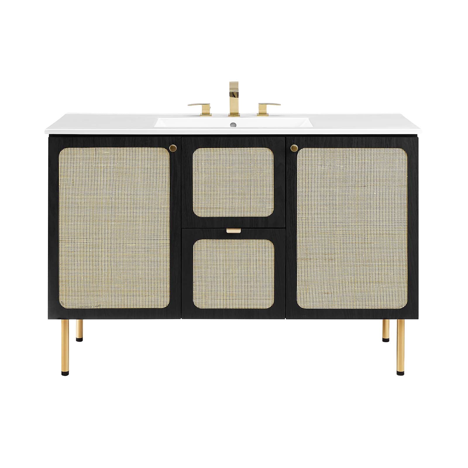 Refresh your washroom with the textured detail of the Chaucer 48" Single Basin Bathroom Vanity. Featuring beautiful rattan weaving on its doors, this vanity cabinet instantly updates any bathroom or powder room. A spacious bottom drawer and a decorative top drawer sit between two hinged doors, each opening to reveal an adjustable top shelf and a fixed bottom shelf, offering ample storage space for toiletries, towels, and other bathroom essentials. With a ceramic basin with 8" centerset holes and an integrated countertop, this vanityÕs design highlights its sleek and spacious countertop for an added touch of elegance. Enriched by stylish round metal cabinet knobs on its cabinet doors and a finger edge pull handle on its drawer, this vanity rests on sleek legs with adjustable feet for added stability. Durably crafted with MDF, particleboard, and wood grain laminate this bathroom vanity washbasin brings natural organic aesthetics to your decor. Assembly required. Fixtures not included. Top Shelf Weight Capacity: 24 lbs. Bottom Shelf Weight Capacity: 46 lbs. Set Includes: One - Cayman 48" Bathroom Sink One - Chaucer 48" Bathroom Vanity Cabinet (Sink Basin Not Included)