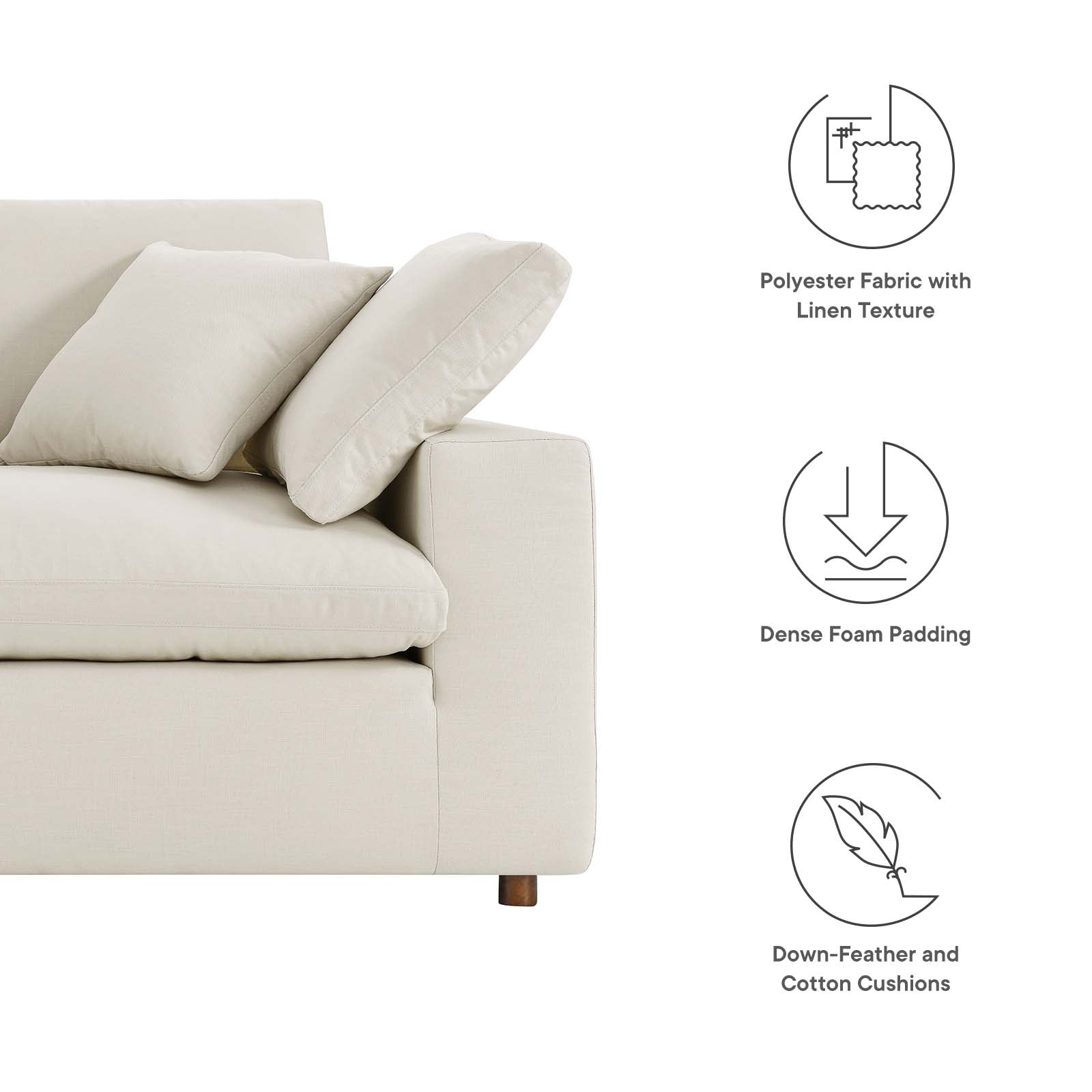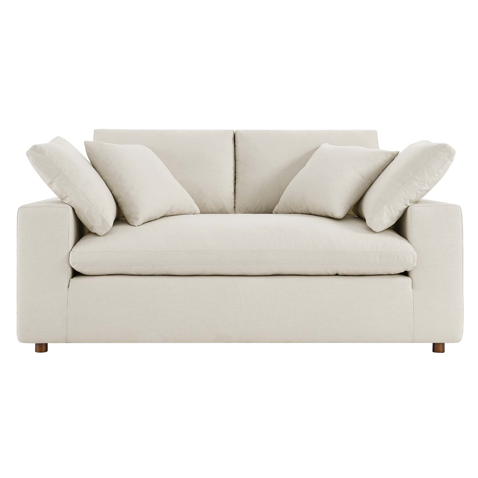 A haven for cozy relaxation, the Commix 2-Seater Sofa features plush comfort, clean-lined design, and a spacious profile, that makes an attractive statement in the modern home. Upholstered in polyester fabric that grants a luxe linen texture, this contemporary loveseat comes with solid wood construction and plush cushions for a luxurious sink-in feel. Commix comes with generously padded down feather and cotton cushions, and padded foam bases, making this sectional sofa collection perfect for the living room, family room, or game room. Made for sprawling out or curling up, Commix beckons you and guests to sit and stay a while. Includes plastic foot glides. Weight Capacity: 660 lbs. Set Includes: One - Commix Down Filled Overstuffed Loveseat