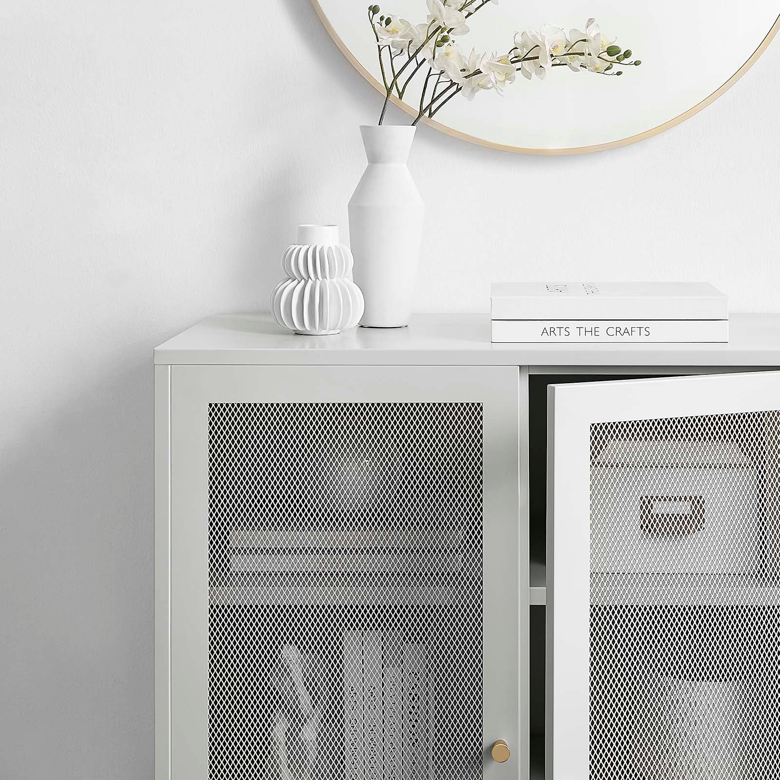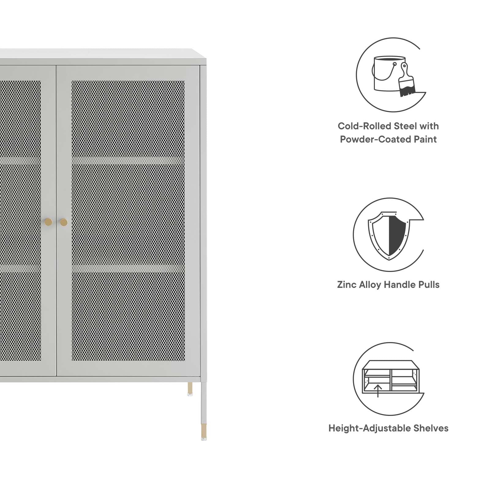 Elevate your home decor and storage needs with the Covelo Accent Storage Cabinet. Crafted with durable cold-rolled steel plates with powder-coated paint, this storage cabinet is built to last. The copper-plated zinc alloy handle pulls and mesh-front doors add a touch of elegance and modern interest to its surroundings. On the inside of this accent cabinet, you'll find two spacious height-adjustable shelves behind magnet close doors. Anti-tipping hardware is included for added safety. The adjustable foot pads protect your flooring from scratches and damage while ensuring stability. Perfect for entryways, living rooms, kitchens, home offices, or dining rooms, our accent cabinet offers a stylish and functional storage solution to suit your needs. Assembly required. Set Includes: One - Covelo 32" Accent Cabinet