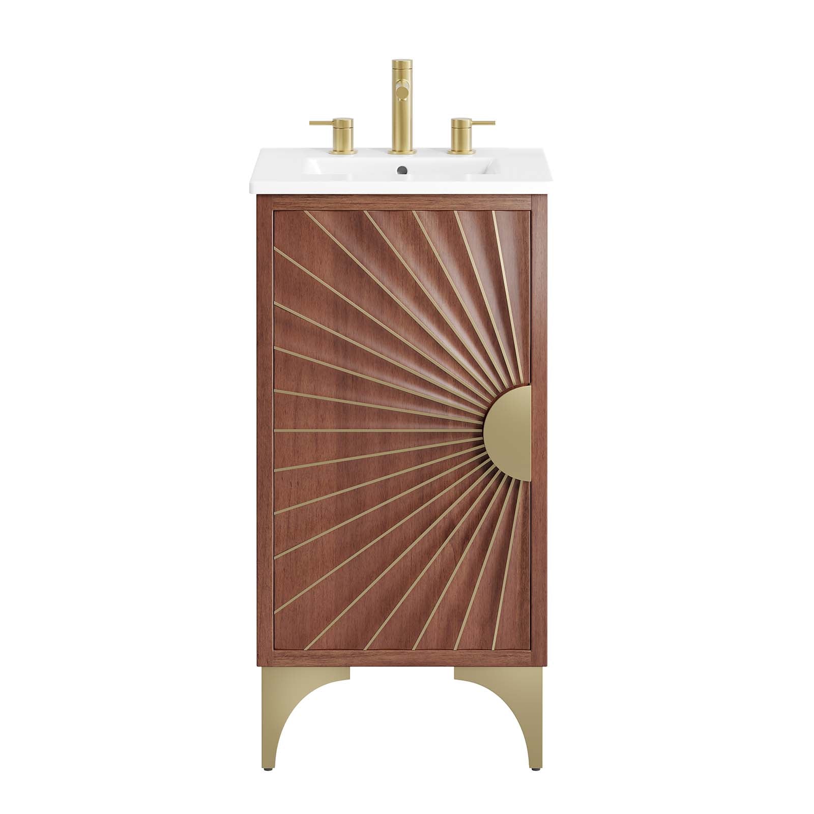 Bring refreshing energy into your bathroom space with the Daylight 18" Bathroom Vanity. Beautifully crafted with solid mango wood and a rich wood stain, this bathroom cabinet features a sun ray design made possible through intricate powder-coated brass details and hardware. This vanity cabinet is a complete addition to a bathroom with a ceramic sink basin and an integrated countertop with 8" centerset holes. Resting on a brass base with arched details and non-marking foot caps, this bathroom vanity offers ample storage space for bathroom essentials with the spacious open shelving. Fixtures not included. Assembly required. Set Includes: One - Daylight 18" Bathroom Vanity