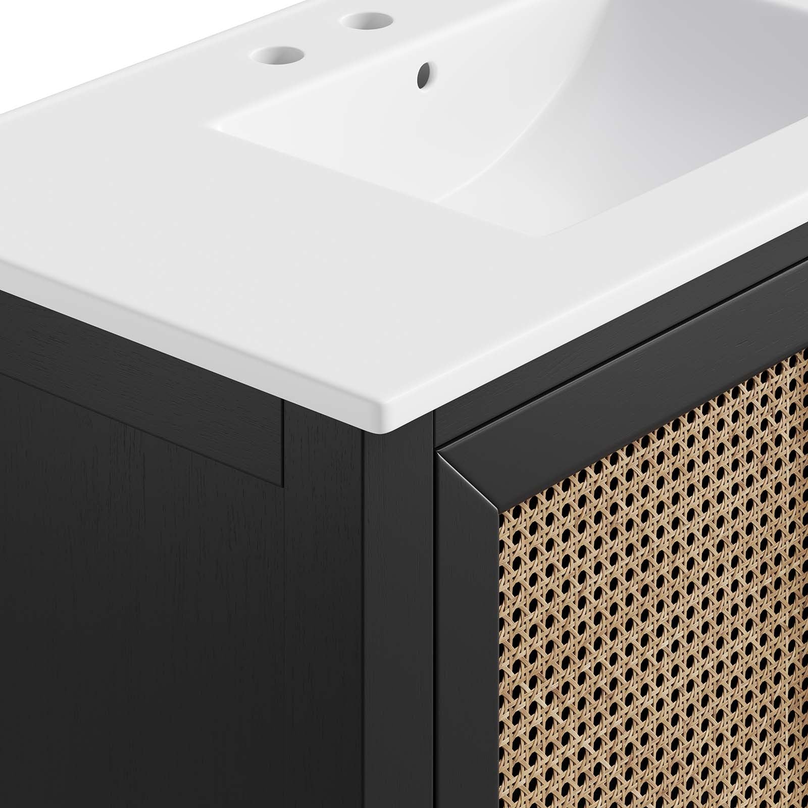 - Bullets: Solid Mahogany Wood Ceramic Sink Basin Open Weave Rattan Detail Satin Brass Handles Soft-close Hinges Fixtures Not Included Assembly Required