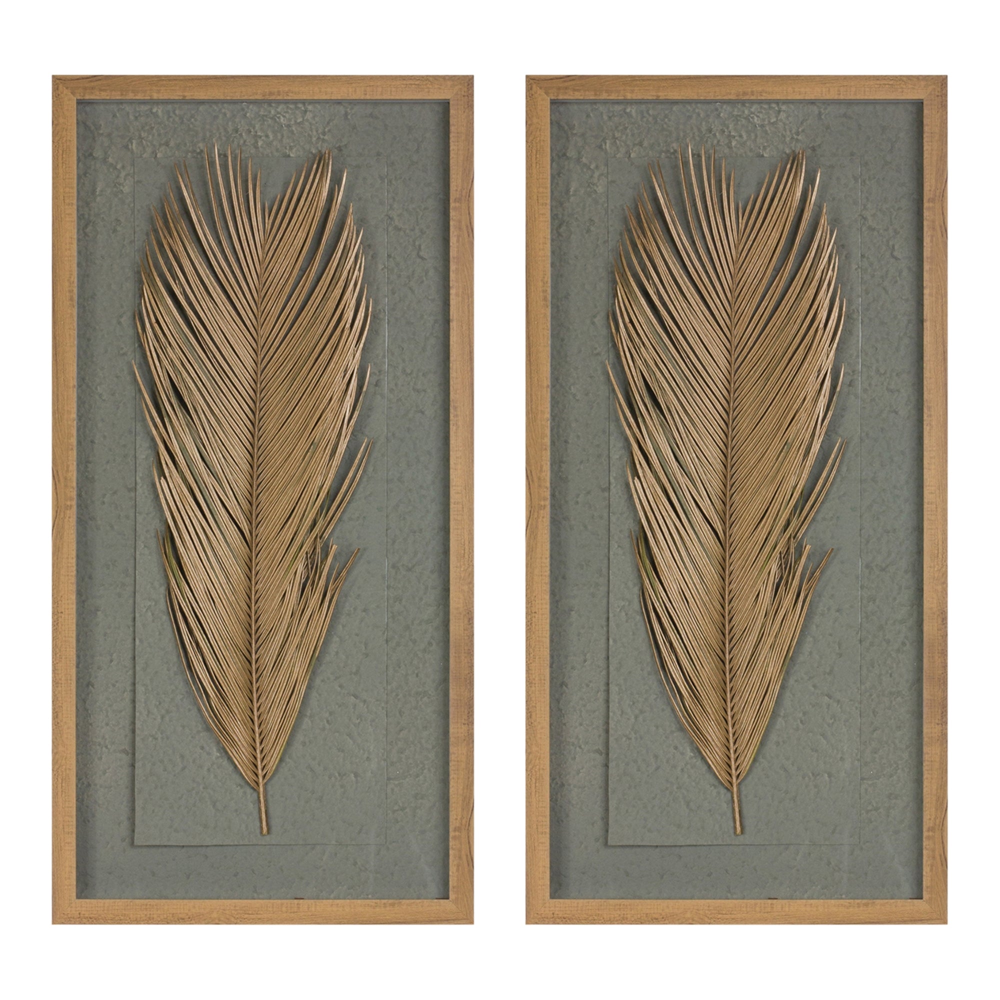 Transform your space with Dried Palm Frames! Our unique and beautiful wall art pieces feature rustic green and beige tones, modern dried palm leaf foliage, natural wood frames, and quality paper composition to bring life and inspiration to any room. Add a contemporary touch to your home or office with our stunning Dried Palm Frames today!, Framed Palm (Set of 2) 14"L x 27.5"H Wood/Paper