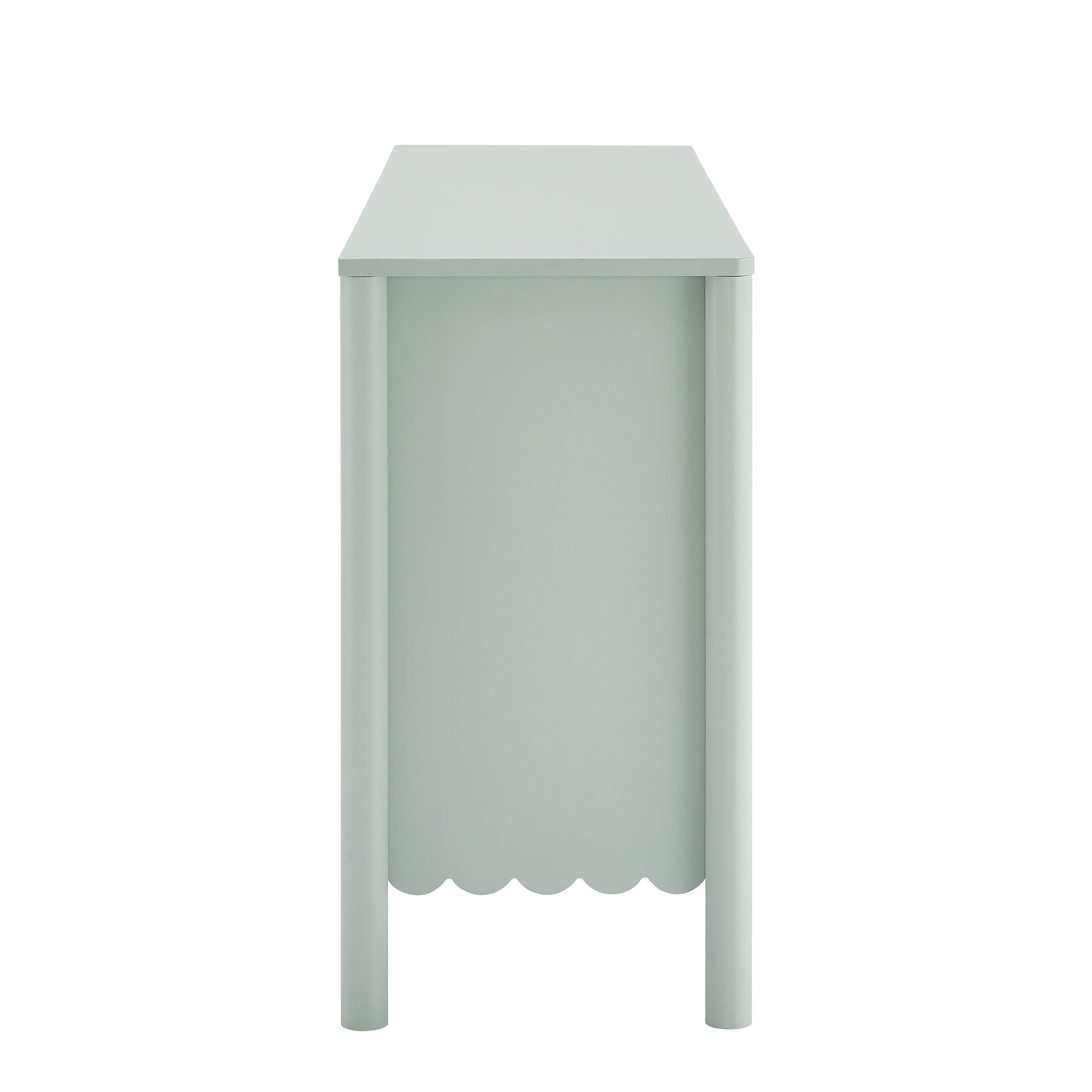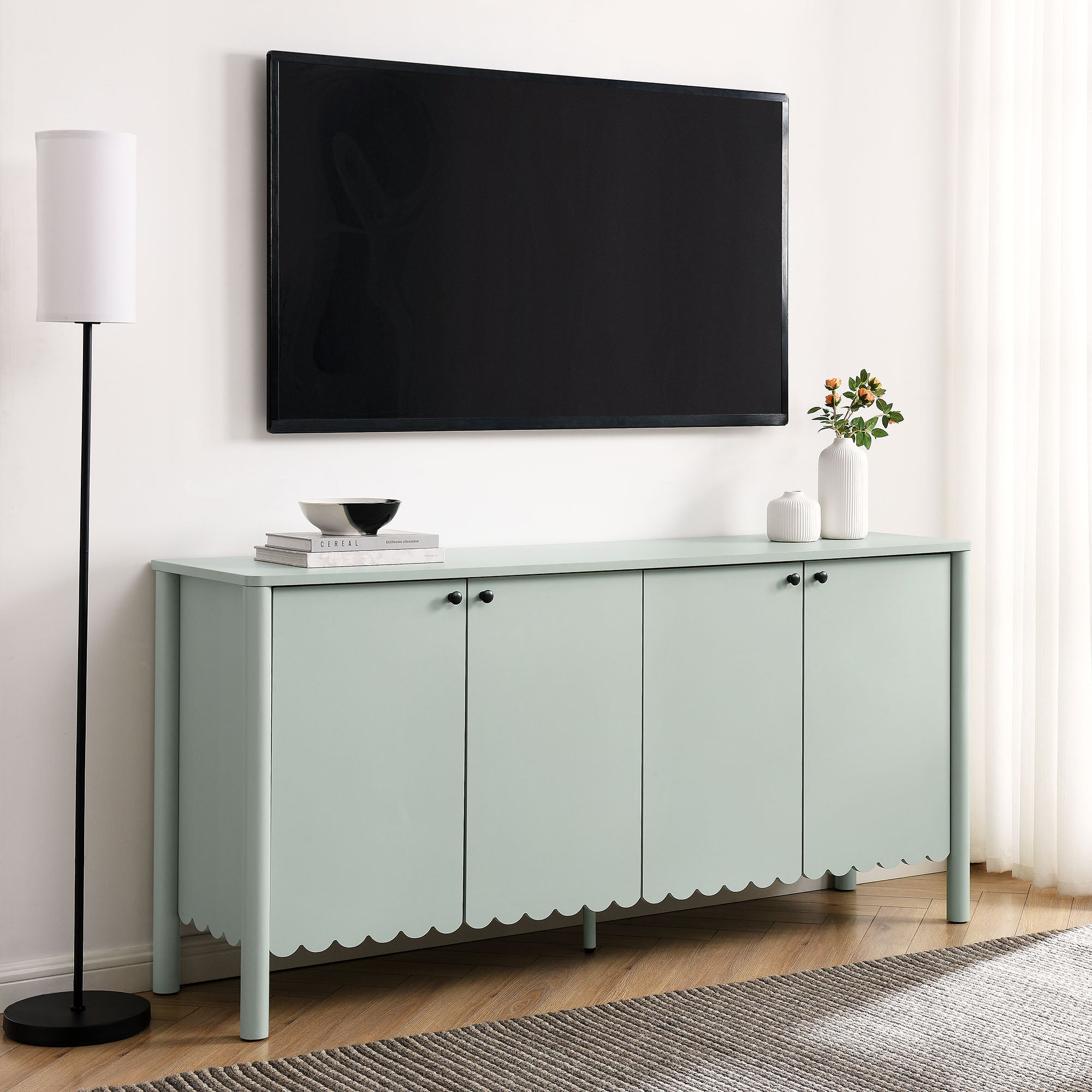 An elegant blend of subtle curves and practical storage, the Emmeline 4-Door Wavy Sideboard Cabinet adds a touch of artistic flair to any room. Its standout featureÑa scalloped bottom edgeÑcreates a soft, flowing silhouette that enhances the modern simplicity of the design. Behind its four soft-close doors, adjustable shelves provide flexible storage space, ideal for organizing dining essentials, decor, or media accessories. Crafted with a sturdy frame and finished in smooth laminate, this wide farmhouse sideboard is as functional as it is stylish. The round door knobs and non-marking glides add to its refined appearance, while ensuring your floors remain protected. Whether serving as a modern sideboard, accent cabinet, or entryway console with storage, Emmeline brings a contemporary, polished look to hallways, dining rooms, or living spaces. Assembly required. One - Emmeline 66" 4-Door Sideboard Cabinet