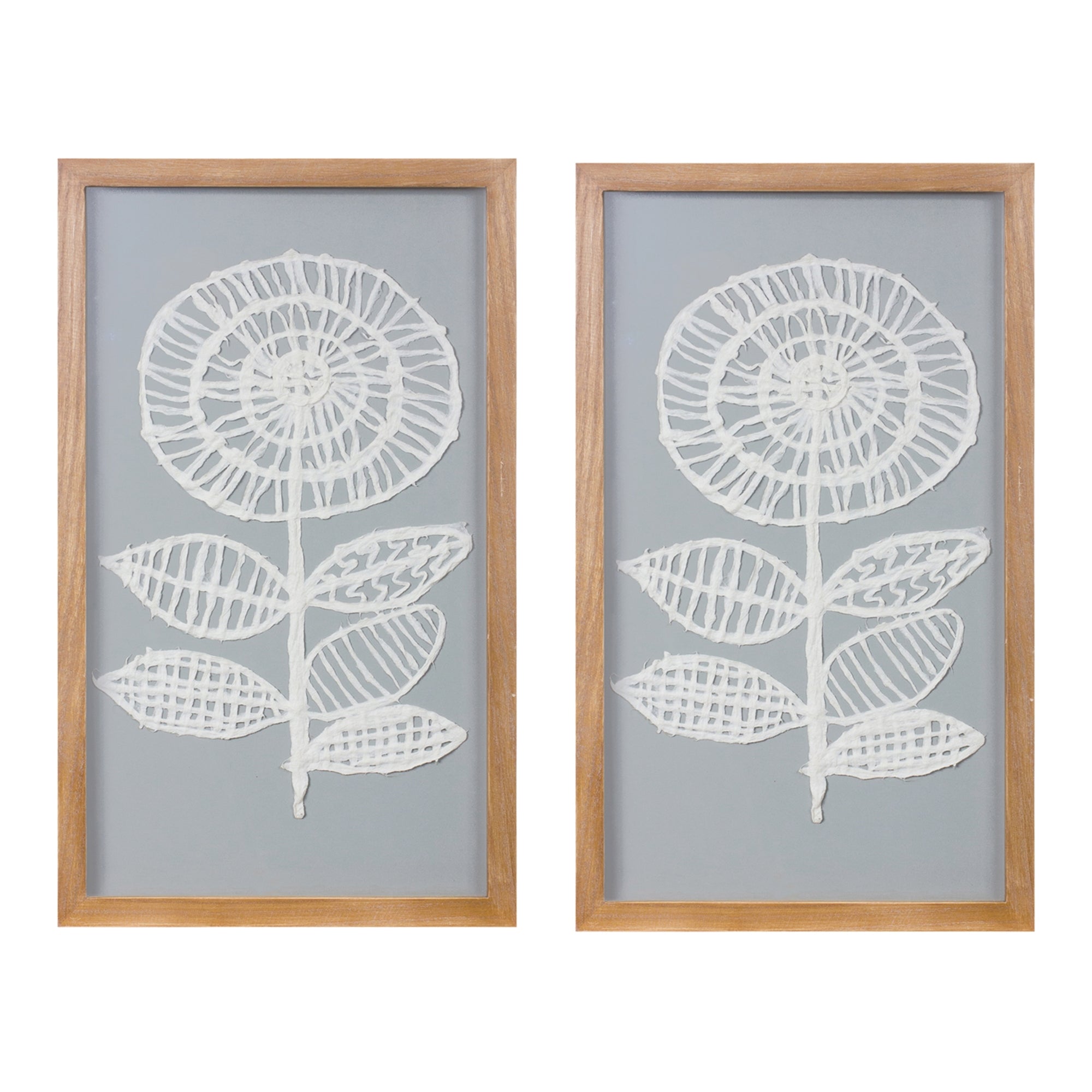 Get the modern, contemporary look you've been wanting with Paper Mache Wall Art. Our paper mache flower artwork is made with neutral white and grey tones, making it the perfect addition to any home or office. The natural wood frame complements the paper composition, creating a unique and eye-catching piece of art. Bring your walls to life with our Paper Mache Wall Art!, Floral Wall Art (Set of 2) 12"L x 20"H Wood/Paper
