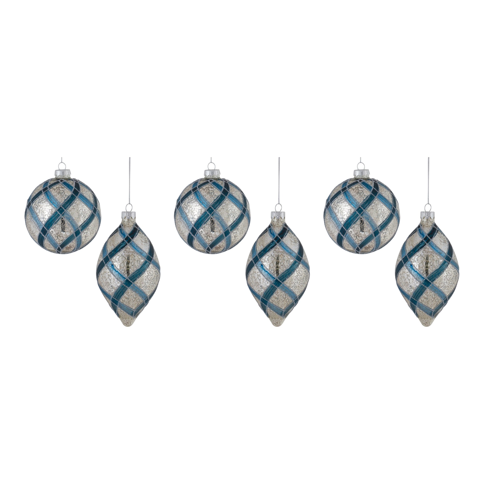 Adorn your Christmas tree and holiday decor with this stunning set of Glitter Net Glass Ball Ornamnets. Featuring 6 pieces, the wintry blue and chic silver tones paired with the glittered design is the perfect combination to create a memorable display. The quality glass composition and delicate silver string hanging accent is sure to endure for seasons to come. Whether you're adding a touch of cheer to your home or gifting to a loved one, these ornaments will definitely bring smiles. , Ornament (Set of 6) 4.75"H, 6"H Glass