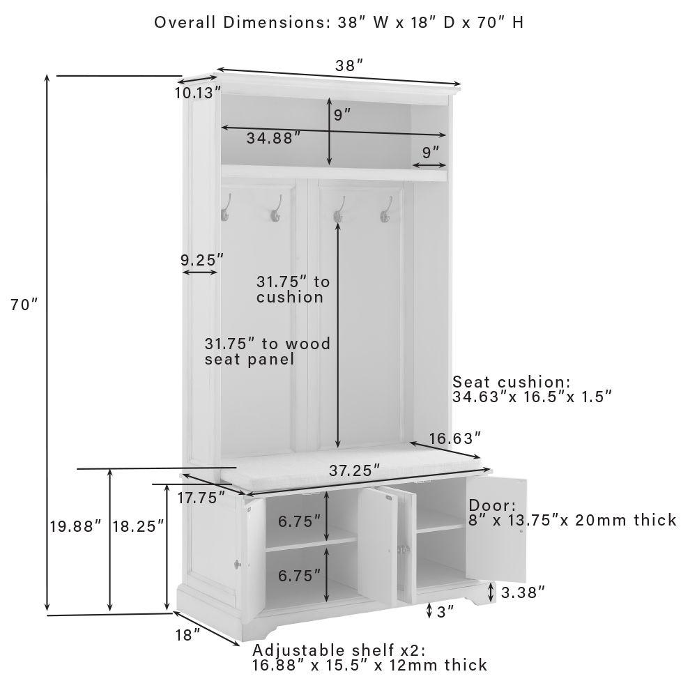 The Holbrook Hall Tree brings vintage charm to any entryway. Featuring a sizable entryway bench and two storage cabinets with adjustable shelves, you can easily sit down and tuck away your shoes at the end of the day. The open stationary shelf corrals smaller items while the four double-prong hooks make an ideal coat rack. Whether you are coming or going, the Holbrook Hall Tree keeps all your everyday items close at hand.