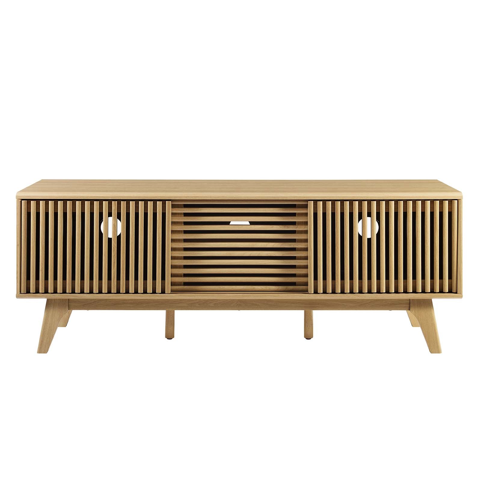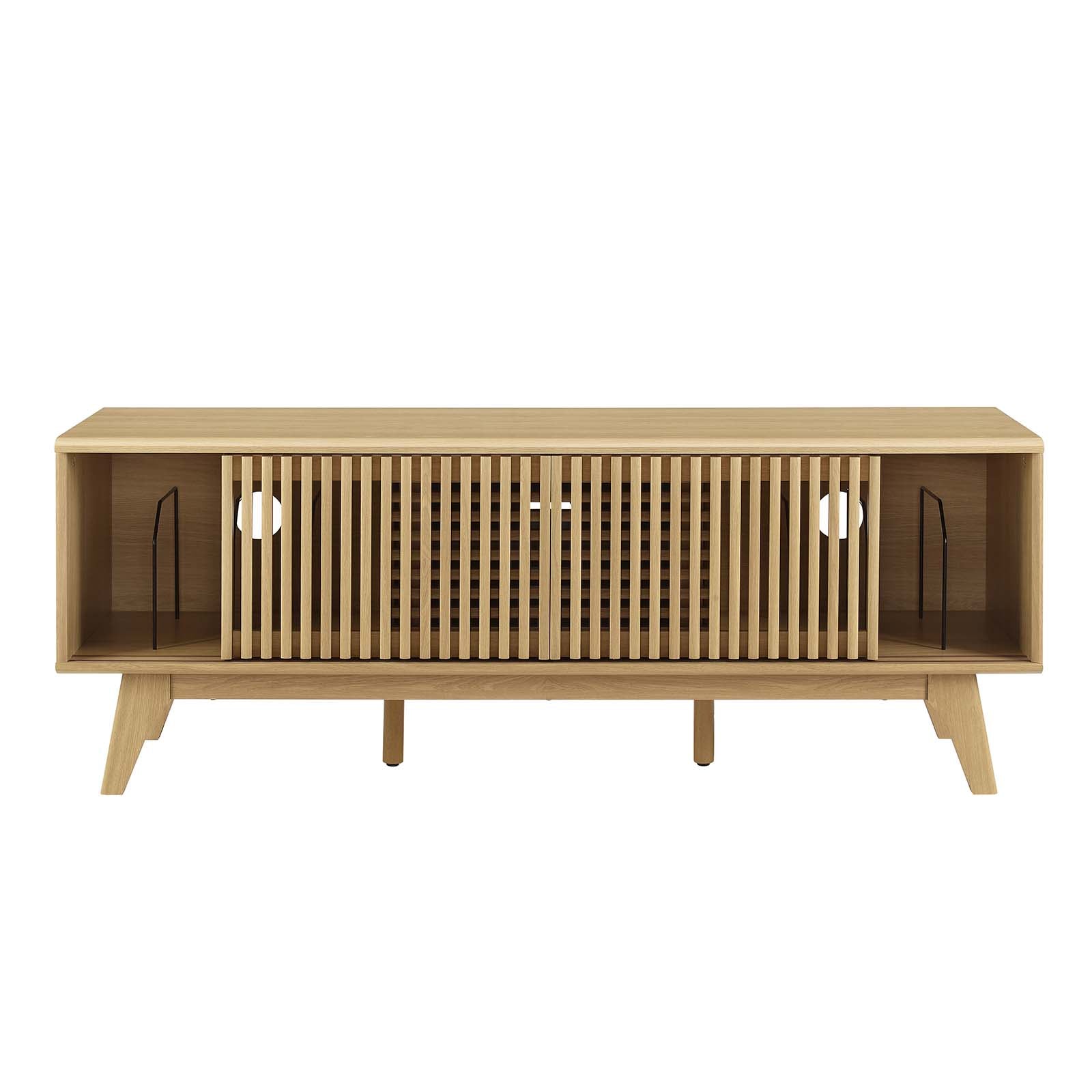 - Bullets: Contemporary TV Stand Particleboard Construction Wood Grain Laminate Cable Management Holes Slatted Sliding Doors Non-Marking Foot Pads Weight Capacity: 192 lbs.