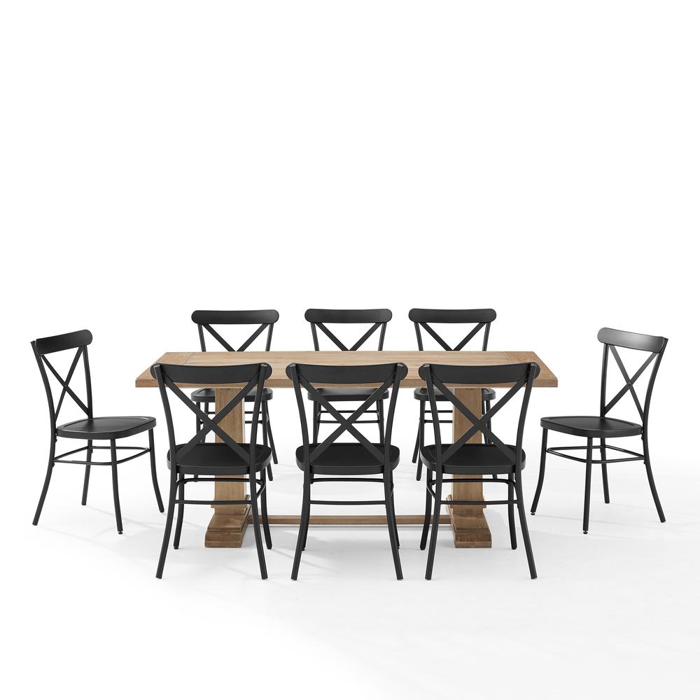 The Joanna 9pc Dining Set with Camille Chairs is where modern farmhouse style meets French industrial chic. Blending rustic wood and sturdy steel, this set features a large rectangle trestle table surrounded by eight all-metal x-back dining chairs. Balancing the tableÕs substantial trestle base is a spacious tabletop, making the Joanna 9pc Dining Set ideal for your next family get together.