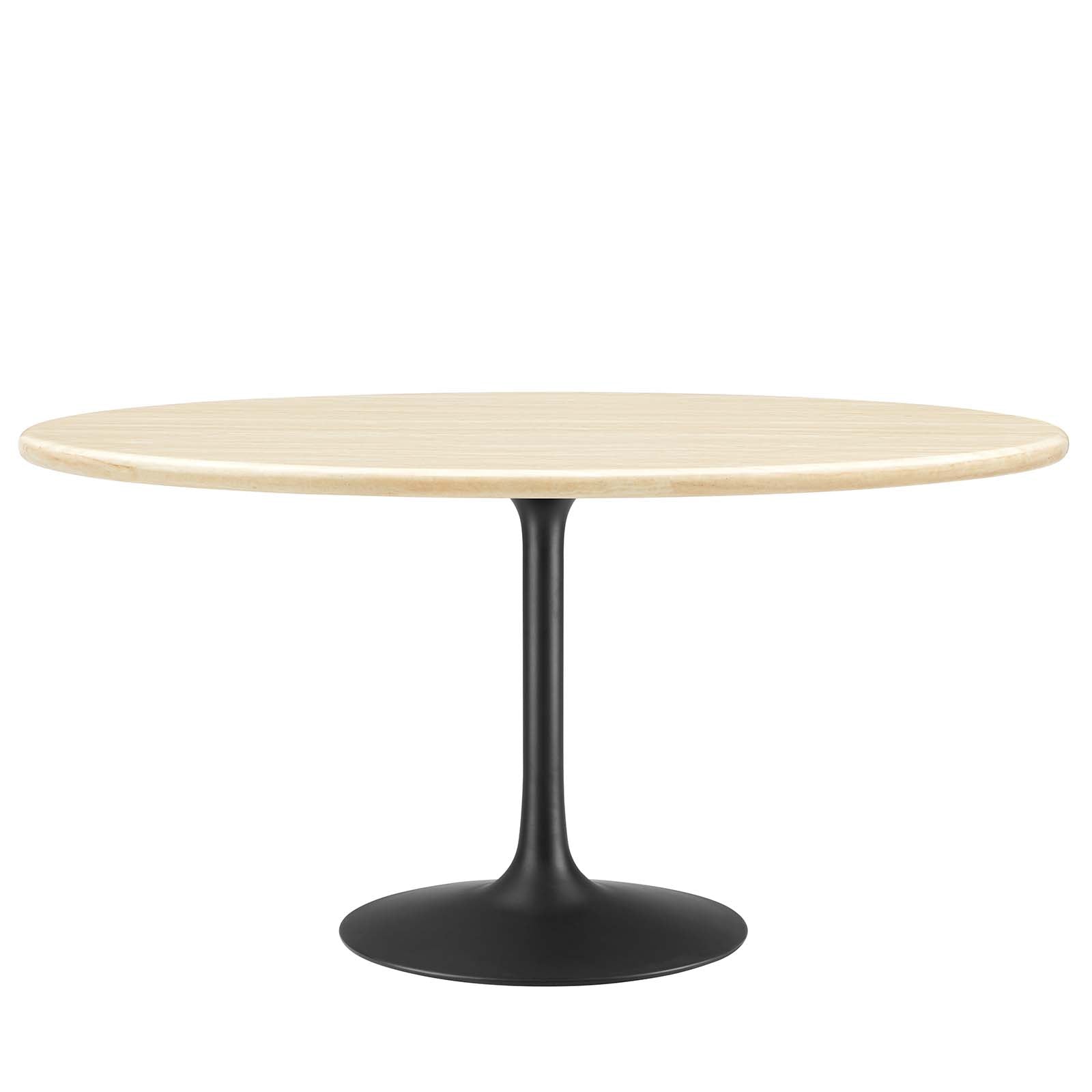 Embrace the day-to-day with the Lippa 60" Oval Artificial Travertine Dining Table. Perfect for everyday meals, the exquisite tabletop, crafted from artificial travertine , exudes modern elegance and offers a comfortable seating area for six. Resting on a tapered, matte black metal pedestal base with a chip-resistant finish, the sleek silhouette complements dining areas, kitchens, living rooms, breakfast nooks, or sunrooms. Includes non-marking felt pad to protect flooring. Assembly Required. Set Includes: One - Dia60x75cmH Table Base One - Oval 60" Table Top