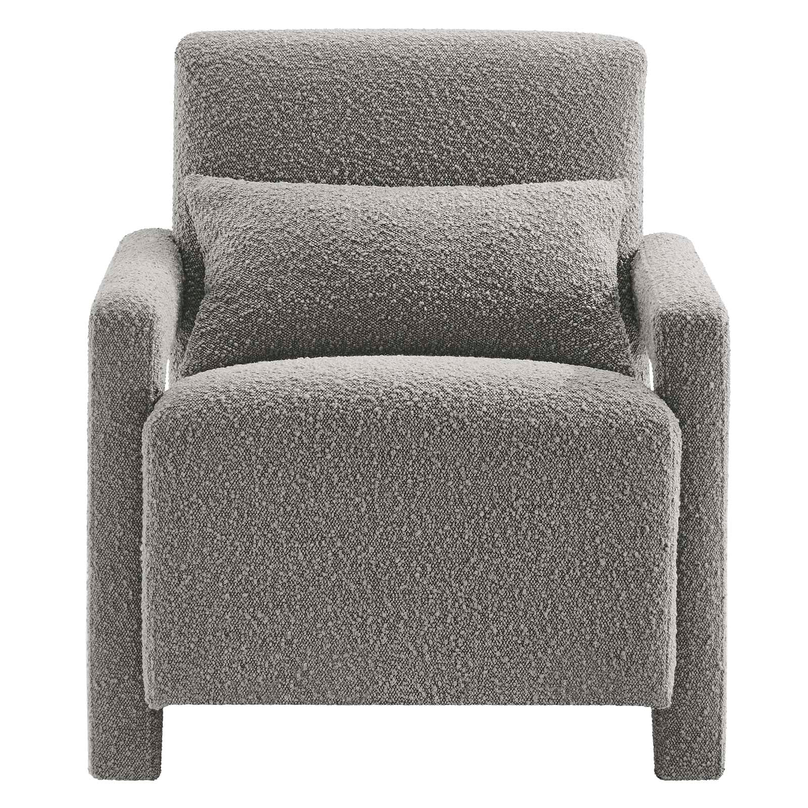 Step into a world of unmatched comfort and style with the Mirage Boucle Accent Armchair. Designed to bring modern style to your living room, entryway, lounge area, or office, this accent chair boasts squared, angular armrests that exude contemporary elegance. Its boucle fabric, with a charming nubby texture, adds a delightful tactile element to the overall aesthetic. Not only does this upholstered armchair make a chic statement in a home or apartment, but it also offers a cozy seating experience. Crafted with a sturdy wood frame and equipped with a sinuous spring support system and dense foam padding, this club chair ensures a premium level of comfort and durability. This stylish living room chair is complete with a complementary accent pillow and non-marking foot glides to safeguard your floors. Weight Capacity: 330 lbs. Set Includes: One - Mirage Armchair