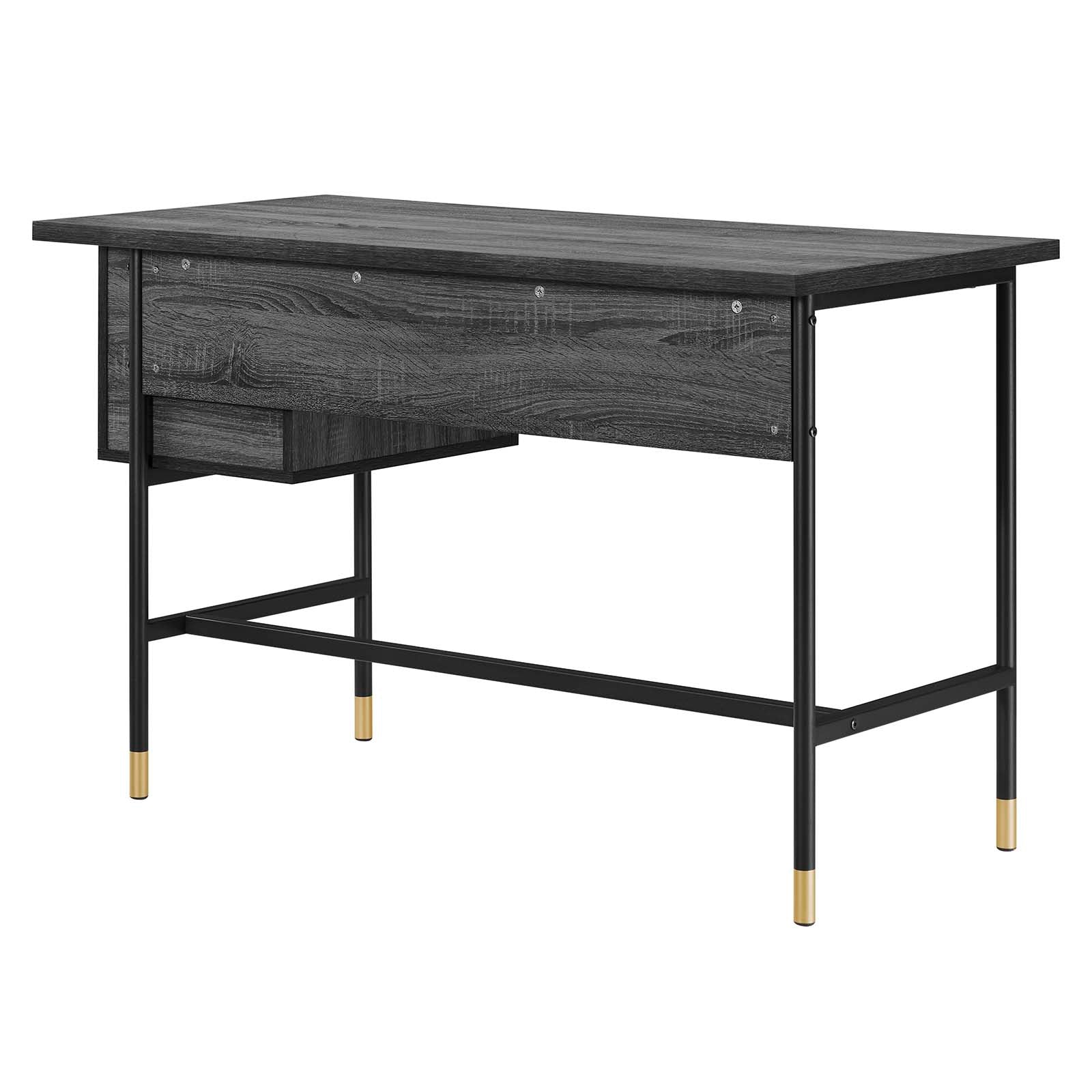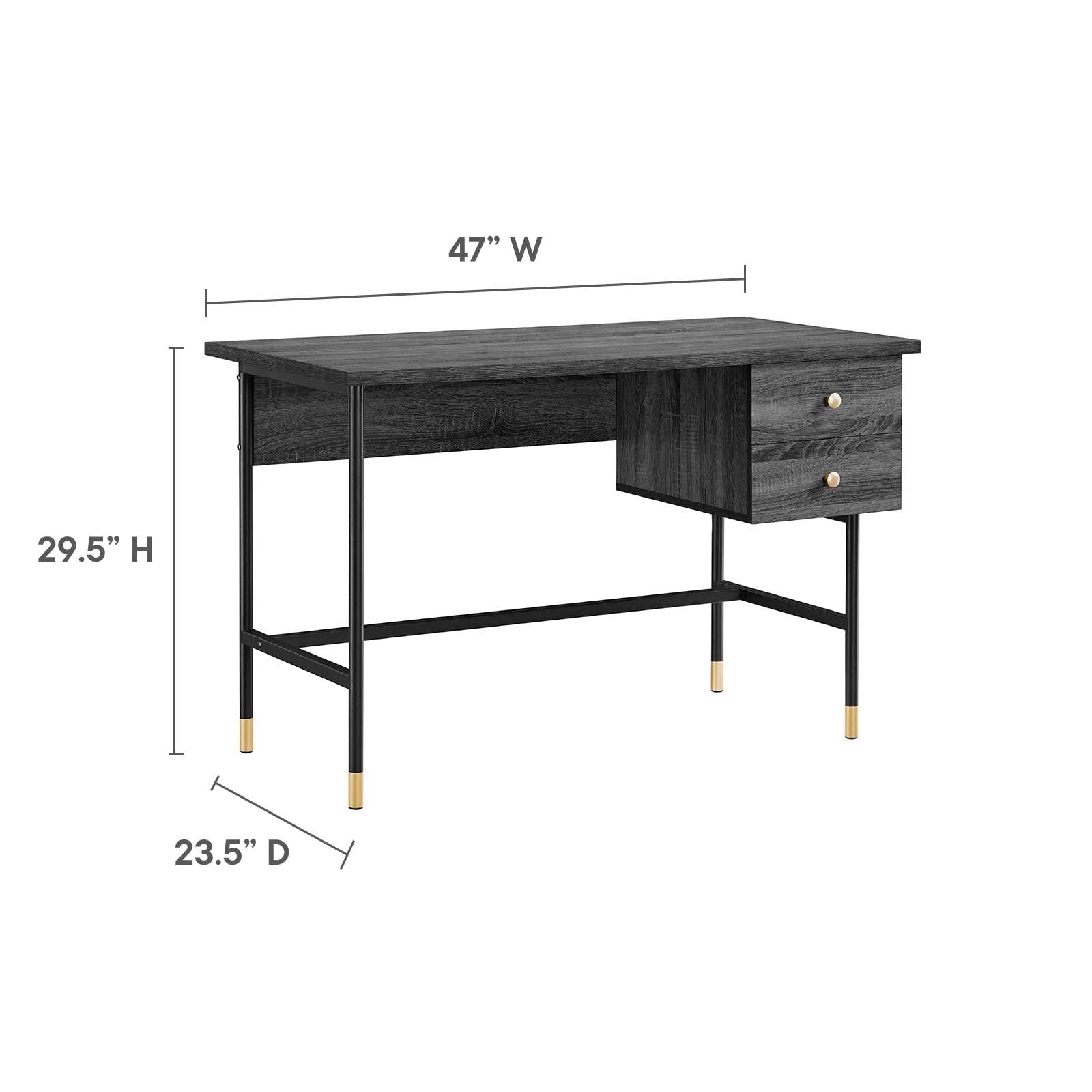 • Bullets: Modern Home Office Desk Particleboard and Wood Grain Laminate Metal Tubular Frame Gold Accents Full-Extension Storage Drawers Assembly Required