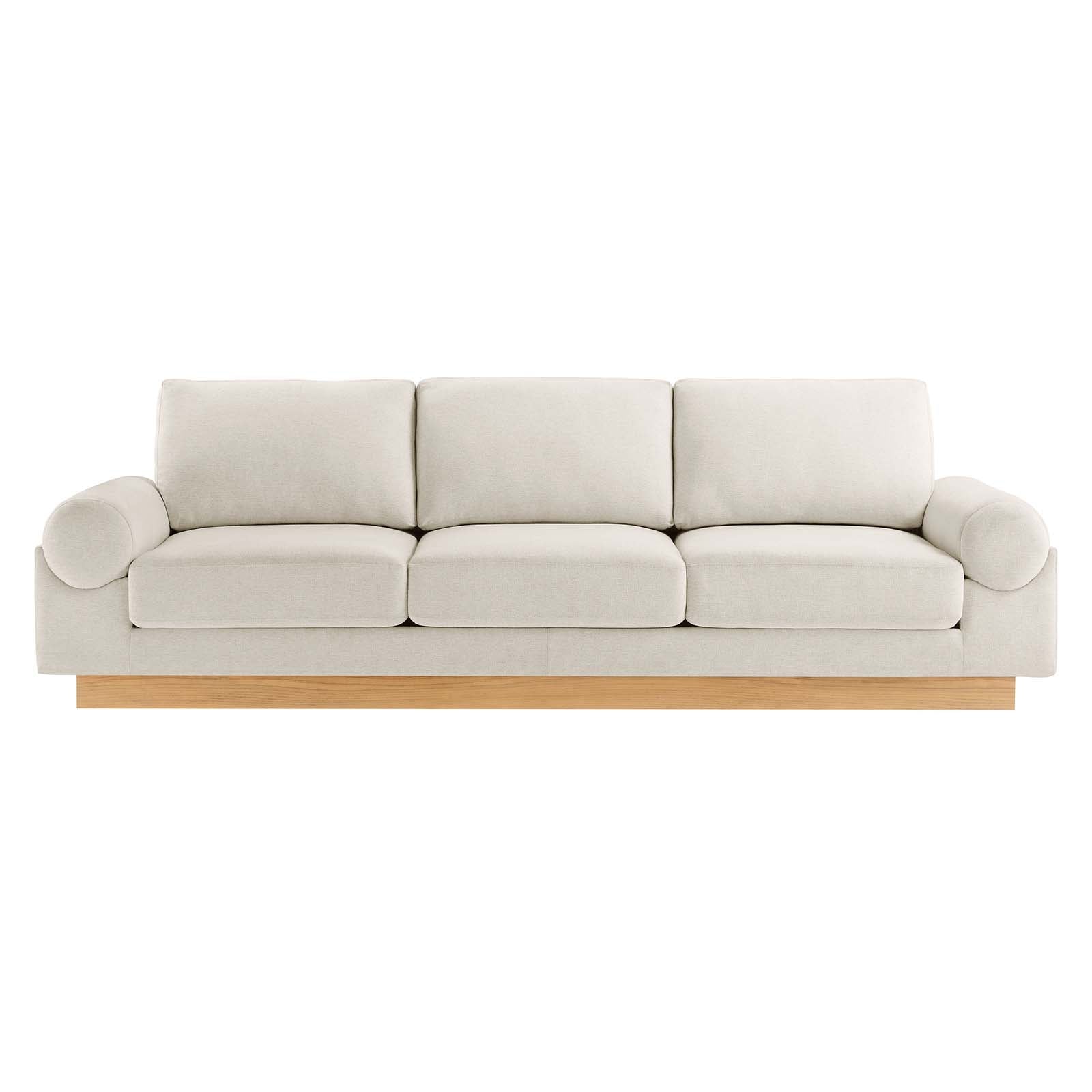 Experience contemporary luxury with the Oasis Fabric Upholstered Sofa bringing modern design and a streamlined silhouette to your living room, lounge area, or office. Featuring a deep, cozy seat, this comfortable couch offers unparalleled relaxation with armrests that resemble oversized bolster pillows. The dense foam padded cushions with pocket springs provide premium support, while the sinuous spring support system ensures lasting durability. Covered in stain-resistant polyester fabric, this upholstered sofa exudes elegance while resting on a sturdy wood veneer plinth base. Assembly is a breeze, allowing you to effortlessly bring this luxurious piece into your home. Elevate your living space with this modern sofa that combines comfort, style, and convenience. Weight Capacity: 600 lbs. Set Includes: One - Oasis Upholstered Sofa