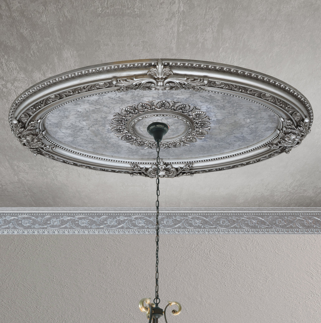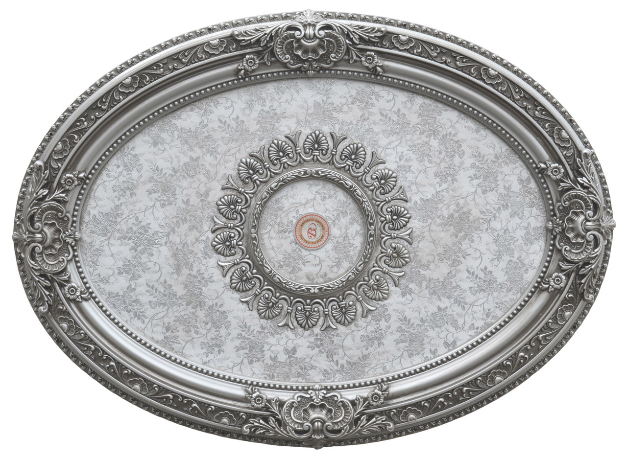 The smaller Antique Silver Oval Ceiling Medallion offered is from Masterpiece Molding, a division of AFD Home. An exclusive new offering in the market, designed to elevate Todays most fashionable living spaces with a defined definition and beauty. The size and oval shape offers many applications for use. The silver finish and antiqued affect of the surrounding outer frame draws attention to the details and the rich inner field. Together they offer a design solution to meet the growing trends of these popular tones. This 3 dimensional ceiling coffer will add beauty for the owner to enjoy as well as value to your property investment. Prior to Masterpiece Moldings creation of this series the only way to have had an advanced ceiling with this level of design, would have been a very expensive addition and an owner willing to take on an elaborate installation project, requiring carpenters, finishers and in some instances even artists. Installation is easy, as the outer ring is created with intermittent spaces designed specifically as the locations needed for installing the simple hollow wall anchors. The item comes fully finished out of the package and is created using light weight, durable polystyrene. The newest and best solution in the market for adding architectural detail to a plain ceiling which also adds a crowning elegance to a Chandelier Installation. The overall measurements are 43.00 x 3 x 31.50. Hollow wall anchors are not provided.