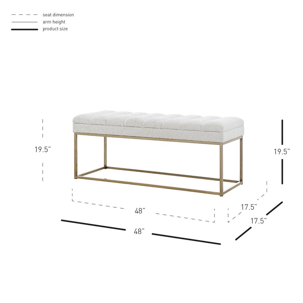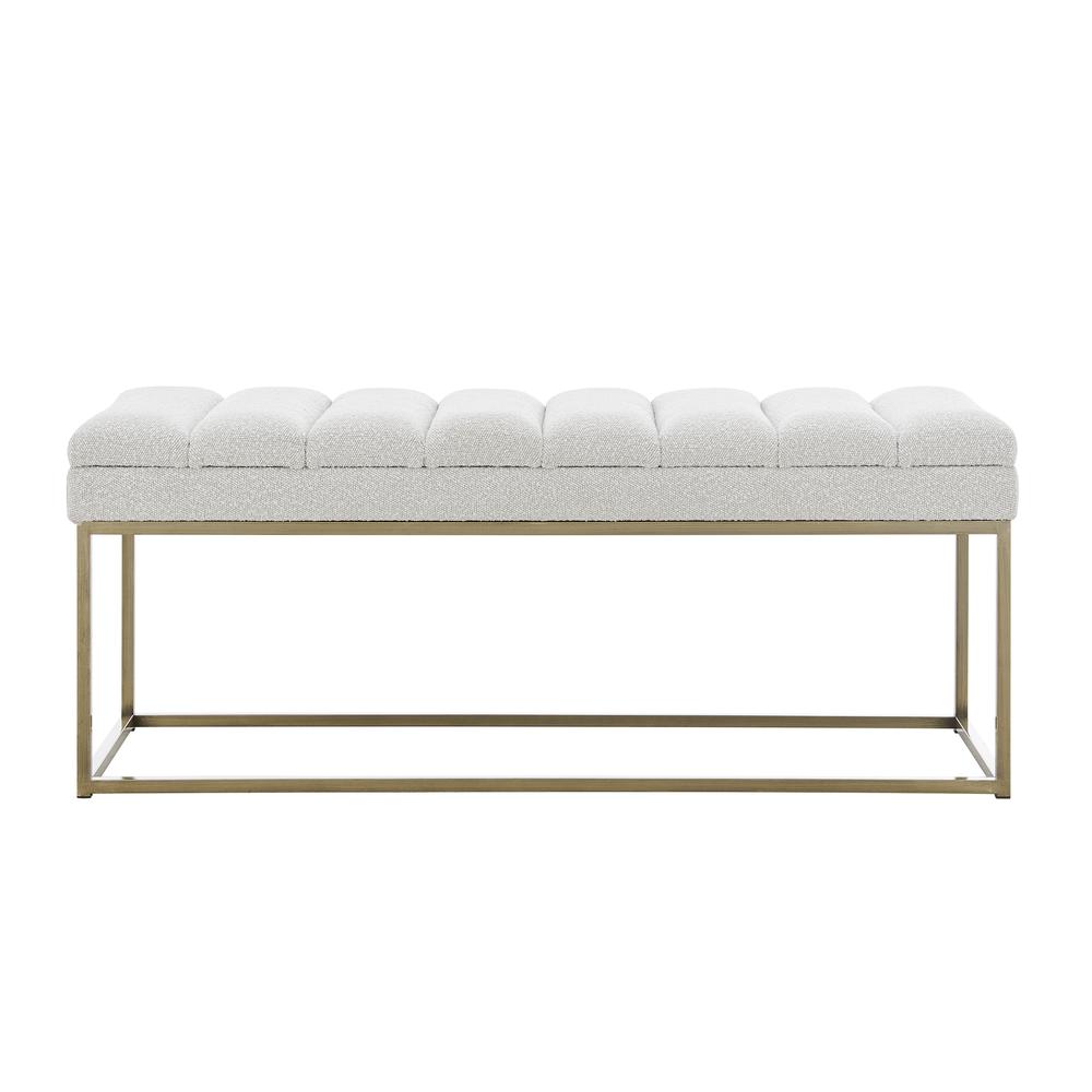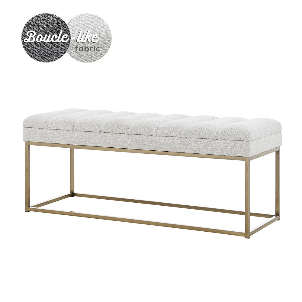 Elevate your space with Darius bench. ItÕs able to transition to nearly any room in the home, wherever and whenever extra seating is needed. Easy assembly. Darius measures 48 inches wide and 17.5 inches deep, and itÕs available in different color options. The steel base is painted a color called Brushed Gold. This one is in the favorite soft boucle-like fabric in Beige tone.