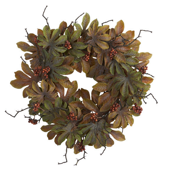 Nearly Natural 24" Fatsia with Berries Autumn Artificial Wreath