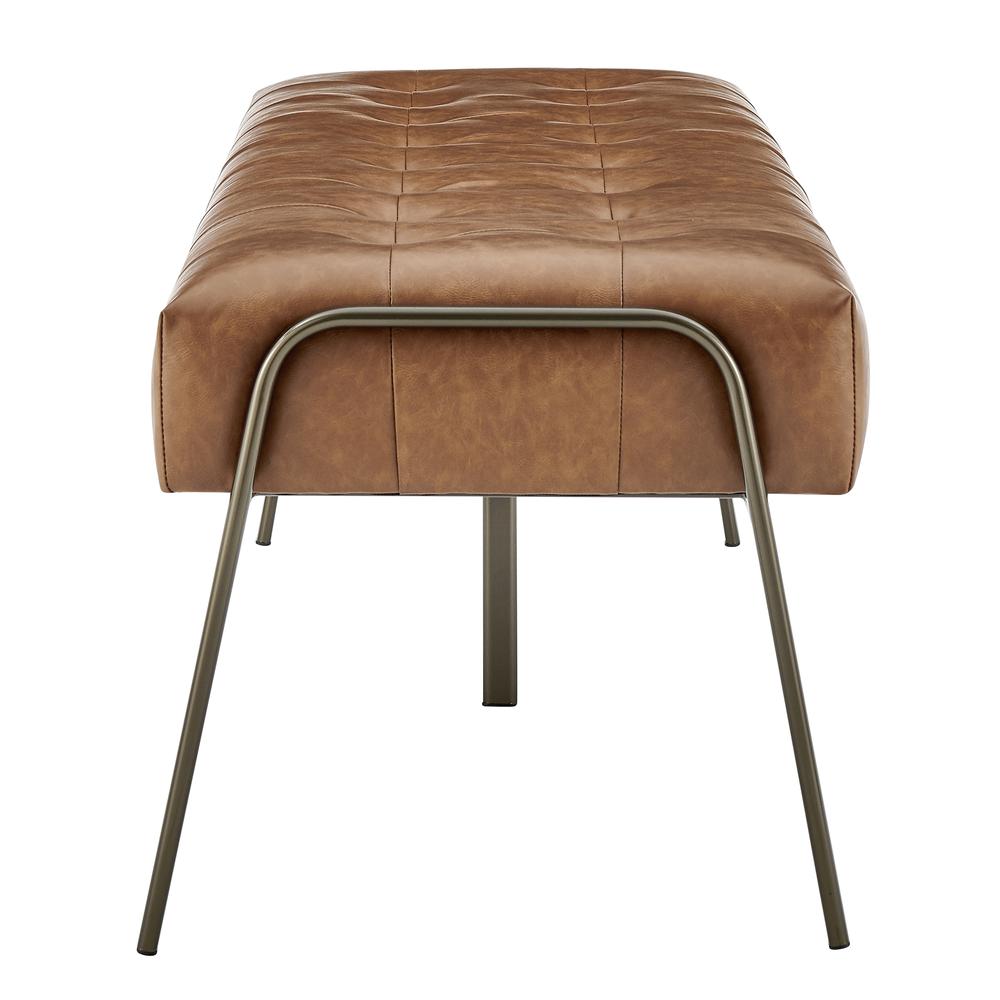 For the hip urbanite or the farmhouse owner, the Venturi tufted bench can be used to provide extra seating, display books at the foot of a bed, or as a convenient package drop-off spot in an entry foyer. Slender Deep Bronze metal legs support a substantial tufted cushion upholstered in lustrous Vintage Cider faux leather upholstery. Fully assembled. Available in other color and upholstery options.