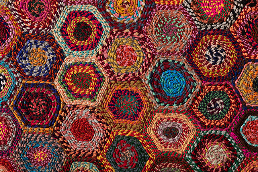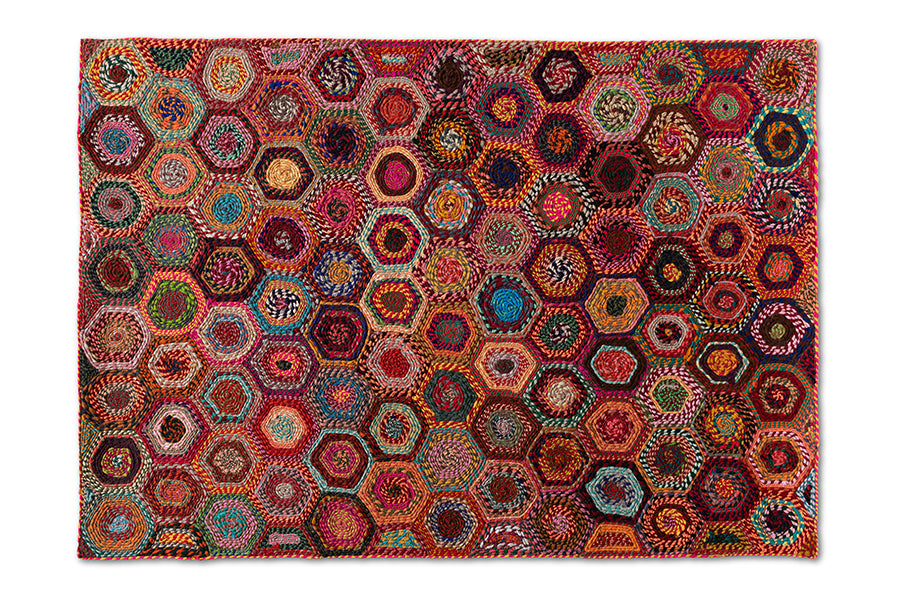 Add an exciting accent to your home with the vivid design of the Adailo rug. Handwoven in India, this rug is comprised of recycled fabric. Its vibrant palette of warm colors creates a stunning display that adds visual interest to any room. A stunning hexagonal pattern accentuates the texture and depth of the rug with geometric appeal. Transforming the modern home with its extraordinary personality, the Adailo rug is a fantastic addition to any space.