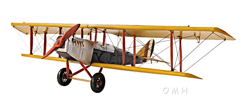 The Curtiss JN-4 "Jenny" was one of a series of "JN" biplanes built by the Curtiss Aeroplane Company of Hammondsport, New York. This fighter bi-plane was one of the most capable, faster and stronger than many of its contemporaries. This replica model of the Curtiss Jenny is handmade on a scale of 1:18. It features iron frame, wire accents, propeller and wheels. A must have for the collector and enthusiast! • 100% iron frame • Metal wheels • Wood propeller • Wheels roll • Propeller spins • Decaled insignia • Landing gear securely welded on • Includes seat