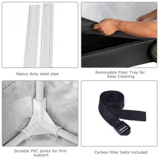 Build an indoor growing room for your plants flowers vegetables and others. Enjoy the fun of growing plants and gardening in your own house at any time! This plant grow tent is specially designed for plants in the early stages of growth. By using this tent you can easily provide your plants with a steady supply of light temperature and water for optimal growth. You can also benefit from flowering period control and better growing of plants. With premium quality convenient design and affordable price this product will provide the best purchasing experience for you. Give your plants the best nurturing environment.Don't hesitate to buy one now! Crafted from tear-proof 600D Oxford cloth with heavy-duty zippers and double stitching for durability Iron metal with anti-rust powder coating combined with premium PVC plastic connectors for reinforced stability Black Oxford cloth lined inside with 100% reflective mylar to block all light from getting out Designed with multiple vents with adjustable nylon straps for different sizes of fans filters and ducting A mesh window to watch your plants from outside and prevent pests from getting in Easily grow plants in a protected area without worrying about temperature & weather conditions outside Removable mylar floor tray making it easy to clean residue spills and water within the tent Easy to assemble and disassemble by following the instructions provided
