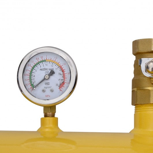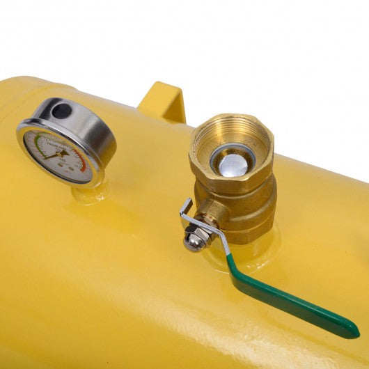 Specification: Material:2.5 MM Carbon Steel Color: Yellow Tank Capacity: 10 Gallons Work On Tire Up To 47� Operating Pressure: 85-116 PSI (0.6-0.8 Mpa) Maximum Pressure: 145 PSI (1 MPa) ATV Tire: 40 PSI Lawn Tractor Tre: 40-50 PSI (2.7-3.4 Bar) Tractor Tire: 100-120(6.8-8.2 Bar) Large Tractor Tire: 120 PSI (8.2 Bar) Car Tire: 50-60 PSI (3.4-4.1 Bar) Truck Tire: 100-130 PSI (6.8-8.2 Bar) 4 � 4 Tire: 6�80 PSI (4.1-4 Bar) Overall Dimensions: 22� � 17.8� � 10.6" Package Include: 1 � 10 Gallons Compact Air Bead Seater 1 � Threaded Barrel