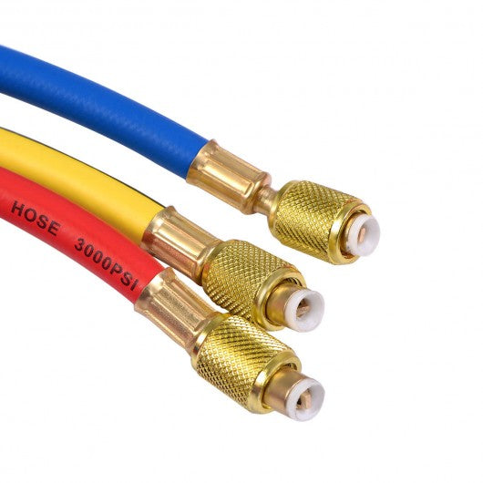 Specification: Operating pressure: 600 PSI Burst Pressure: 3000 PSI Hose Connectors: 1/4" SAE Gauge Reading: R134a Hose Length: 6 FT Blue gauge (low): 2-1/2" diameter 0-120 PSI with 0-40 VAC Red gauge (high): 2-1/2" diameter 0-500 PSI 60” Color coded charging hose Red Hose (1/4” FFL x 60" with knurled fittings) Blue Hose (1/4” FFL x 60" with knurled fittings) Yellow Hose(1/4” ACME x 60" with knurled fittings)