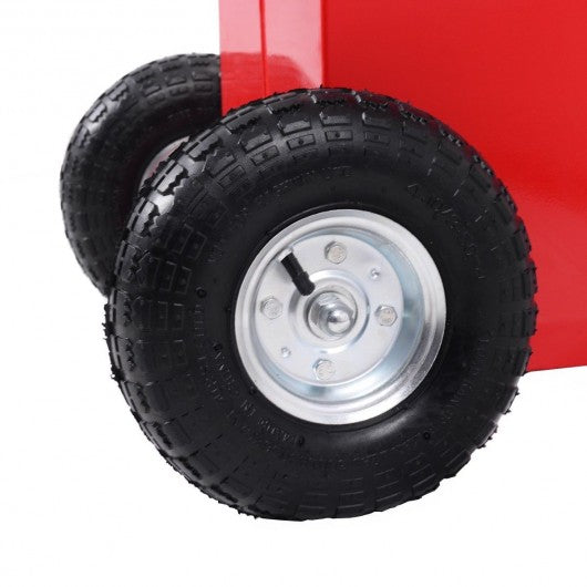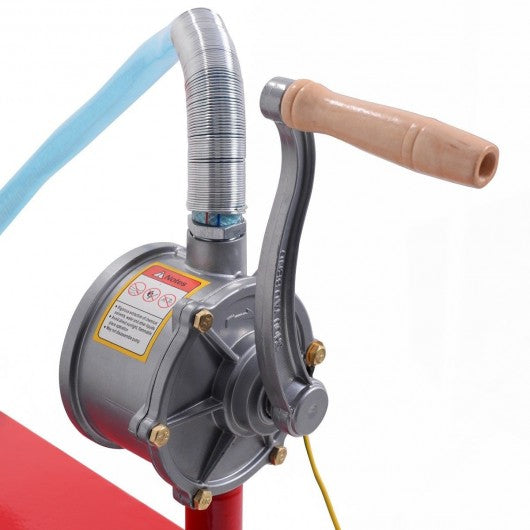 Specification: Main material: Steel Color: Red Speed of rotary pump: 25 RPM Pump flow volume: 15 L/80 RPM Size of oil tank: 15.0" x 15.0" x 30.5" (L x W x H) Hose size: 8 ft Pump lift: 16.4 ft Diameter of wheel size: 10"