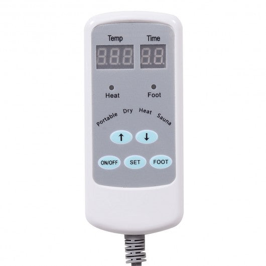 Specification: Color: Black / Coffee / Silver Material: Water-proof cotton cover and plastic trestle Dimensions: 36.6” x 27.6" x 31.5" Voltage: 110 - 120 V Power: 900 – 1050 W Temperature range: 60 °F - 140 °F Timer: 0 - 60 minutes Capacity of chair: 220 lbs Product weight: 20 lbs Package includes: 1 x portable far infrared sauna 1 x folding chair 1 x foot heating pad 1 x foot massager 1 x remote control 1 x manual (please read manual before use)