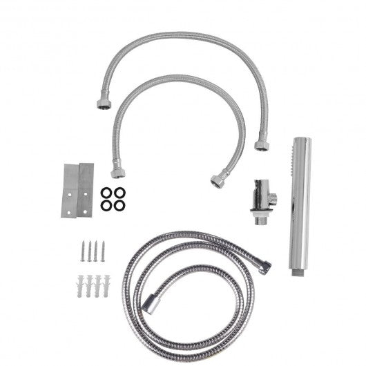 Specification: Color: As the picture shows Material of body: Solid 304 stainless steel Material of the handle: Electro galvanized alloy Overall dimension: 58.3" x 8" x 3" Net weight: About 17 lbs Accessories: 1 x shower panel set 1 x 59" EPDM shower hose 2 x 19.7" SS braided hose