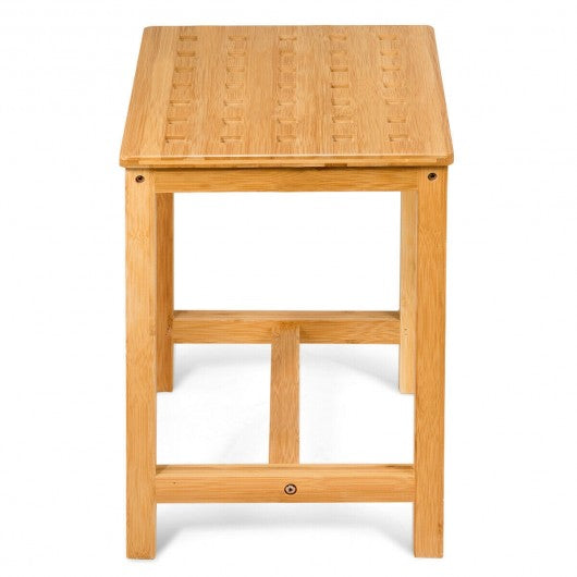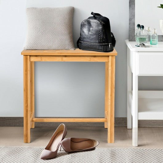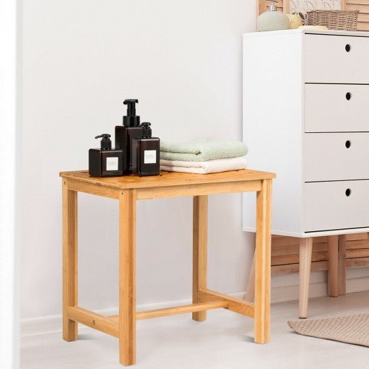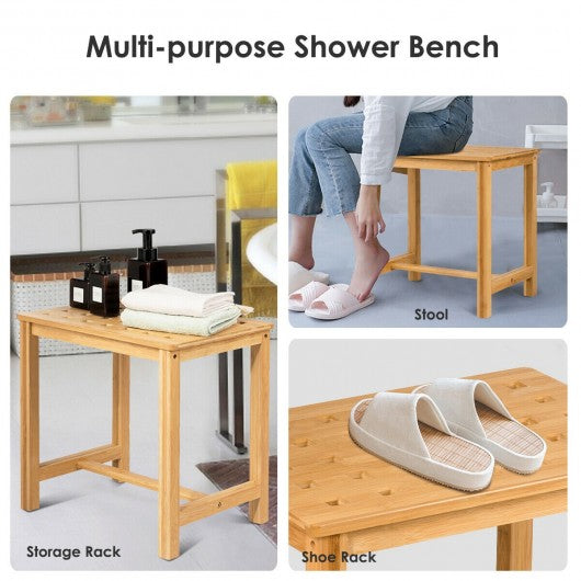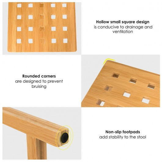 This bamboo shower bench is the perfect helper that offers a safe and comfortable showering experience for you.   Made of bamboo this shower bench is environmentally friendly sturdy and durable. The PU paint coating and special venting holes are specially designed for moisture-proof features and good ventilation. Moreover it is equipped with non-slip pads to increase the stability of stool and to protect your floor from getting scratched. You can use it as a storage rack or as a sitting stool.   It is also perfect for both indoor and outdoor use. Don't hesitate to buy it!   Note: Please put a shower bench in a dry and ventilated place after using it Full body PU paint coating for effective moisture-proof features Made of bamboo; environmentally friendly and durable Non-slip pads add additional stability to the stool Suitable for most locations such as the bathroom bedroom living room etc Lightweight and compact design allow you to move it with ease The simple assembly process with all needed parts included in the package Large surface for a comfortable bath The additional rod under the bottom makes the stool more stable