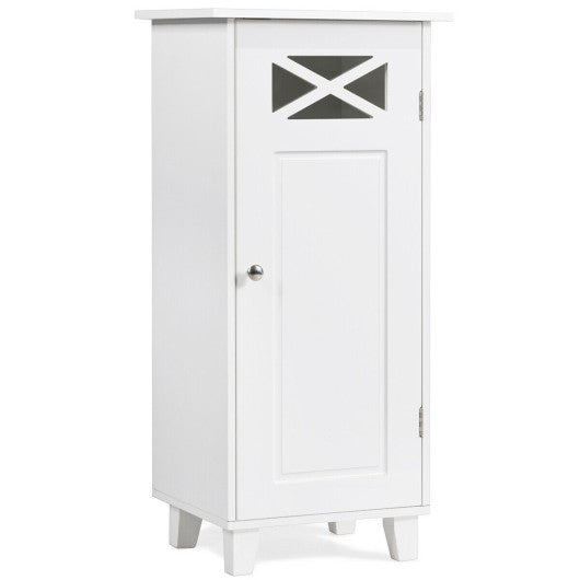 This floor storage cabinet with single door can add elegance and neatness to your living space! Featuring a wide tabletop and 3 compartments behind the door this bathroom storage cabinet provides ample storage space for your daily items like towels shampoo bottles tissues books plants decorations etc. Besides the 3-position adjustable shelf allows you to store items with different heights. Made of premium MDF with exquisite workmanship this bathroom floor cabinet ensures long-lasting use. 4 sturdy legs with anti-slip foot pads enhance the overall stability. The unique glass door design adds elegance and convenience. Featuring a simple and modern design this floor storage cabinet with white finish can fit well with any home decor. Besides it can be placed anywhere in your home – bedroom bathroom living room or entryway to offer additional storage space. If you are looking for it don't hesitate to buy it! 3 storage compartments to hold all your toiletries or other items Middle 3-postion adjustable shelf meets various storage needs High quality MDF material ensures great stability and durability Wide tabletop offers extra space for plants photo frames etc Magnetic door holder helps to close the door easily and noiselessly Round metal knob allows you to open and close the door easily Elegant and visible glass door design for both style and practicality 4 thickened legs with anti-slip foot pads increase stability Ideal for bathrooms living rooms entryways bedrooms etc Simple and modern design fits well with any home style Easy to assemble with detailed instruction