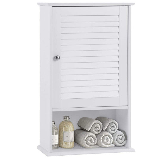 This wall mounted cabinet combines stylish and functionality to create a modern home furnishing ideal for use in bathroom bedroom and any space to store items. With white finish elegant and simple appearance this cabinet will well match with your furniture in your home. It can perfectly blend in various decoration styles and leave your guests a deep impression. Featuring an open cubby and 2-tire cabinet with window shade door this cabinet adds storage space to your room . It is ideal option for small bathroom. Sufficient space to storing and organizing linens toiletries and bath essentials like soaps shampoos body wash and more. Tthe design of door not only to hide the item but also to keep moisture and dust out. Our cabinet made of thick MDF board with smooth paint waterproof and anti-corrosion which ensures durable and sturdy. So don't worry this bathroom cabinet can provide long time service for your family. If you are looking for a wall mounted cabinet like this do not hesitate to place an order! Brand new and high quality Wall-mounted design maximizing the bathroom space Made of engineered MDF sturdy and durable Spray-painted process can withstand a humid environment An open shelf and two storage compartments with single doors offering large storage space The shelf of the storage compartments is movable three selectable heights Modern and stylish Perfect storage solution for any bathroom or kitchen Assemble requirement
