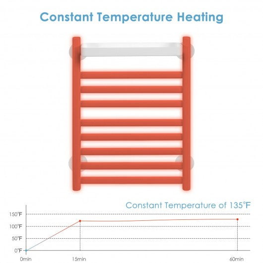 The heated towel rack features fast heating and constant temperature around 122℉ to 135℉ which can provide a warm and clean towel every time you take a shower. Additionally made of high-quality aluminum alloy the towel warmer is durable enough for years of use in daily life. The towel warmer is silent while heating and will not bother your life. 8 horizontal bars and a top tray enable you to hang all of your towels and place more toiletries to create a neat bathroom. It is worth mentioning that the towel warmer is installed on the wall by sticky suckers so that you don't need to punch holes. The modern-style heated towel rack is suitable for your home hotel apartment and spa. High-quality materials ensure long-term service 8 Horizontal bars help you hang towels of different sizes The top tray provides more storage space Reach optimum temperature from 122℉ to 135℉ within 15 minutes Be installed by sticky suckers and don't need to punch holes in the wall Wall-mounted design can take up less space The smooth surface will not be scratched Lightweight design for easy movement Suitable for home hotels spas etc The plug is UL certified for safe use