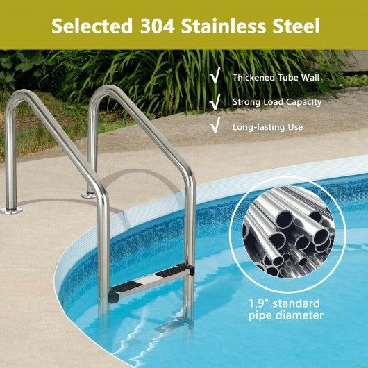 This stainless steel 3-step ladder will be a great helper for you to get in and out of the swimming pool! Coming with completed accessories and detailed instructions this pool ladder is easy to assemble. It can be mounted on the edge of the pool for the swimmers up and down the ladder. The ladder is crafted from selected 304 stainless steel material which has strong rust resistance ensuring a long service life. Each step is designed with anti-slip pads on the surface to avoid you from slipping. In addition the handrails conforming to ergonomic design provide a comfortable and safe grip. Moreover featuring sturdy construction the pool ladder can support users up to 265 lbs leaving you no worry. If you are looking for a swimming pool ladder like this do not hesitate to place an order! Made of premium 304 stainless steel to ensure long-lasting use 3-step structure helps you get out of the swimming pool effortlessly The smooth polished surface has high gloss and is easy to maintain Stable construction ensures a strong weight capacity of 265 lbs 2 curved handrails provide great convenience and support Anti-skid footsteps avoid potential dangers and enhance safety Widely used in indoor pools outdoor pools water parks etc Each part is tightly connected for enhanced stability Easy to assemble with detailed instructions
