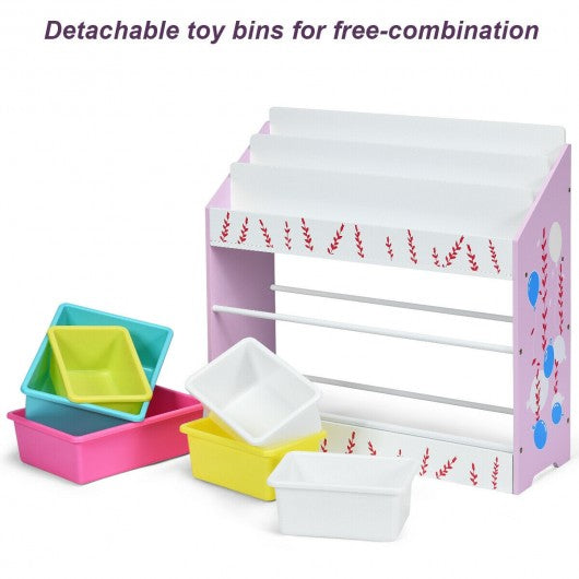 If your living room is occupied with the children's toy you may need the kids' toy storage organizer to help you to clean with it. It is designed with six different size of toy bins and three convenient book shelf sleeves to create the large storage spaces to display children's books toys cartoon cards blocks crayon and stuffed animals. With light pink board cute grass pattern and multicolor bins this toy storage organizer will appease to all children. It is ideal for your children to learn to organize their own supplies and you can finally enjoy the clutter-free environment. The environmental friendly material makes it possible for you to place it on the living room bedroom kids room playroom or classroom for daily use. It must be a great gift for your child and just buy it now! Six bins and three book shelves provide large storage spaces Different size of toy bins can organize different size of belongings Detachable bins are ideal for free combination at your option Colorful outlook makes your children feel much more pleasant Non-toxic and odor-free MDF can protect children's health Durable and steady construction can promise a long time use Specific instruction help you to assemble it within few minutes Ideal for living room kids room playing room and class room Smooth surface make it more convenient to clean and maintain
