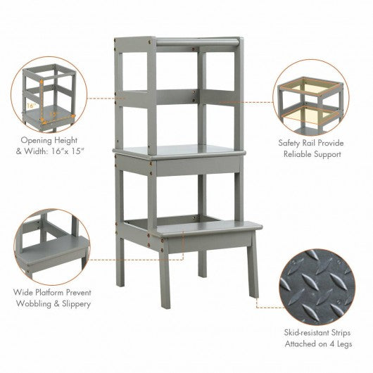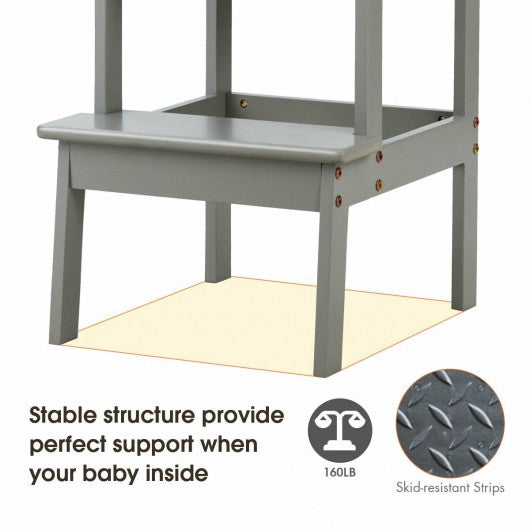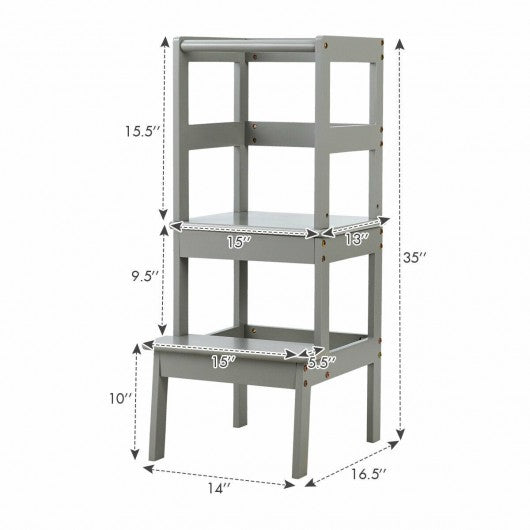 Wooden Kids Kitchen Learning Toddler Tower w/ Safety Rail-Gray