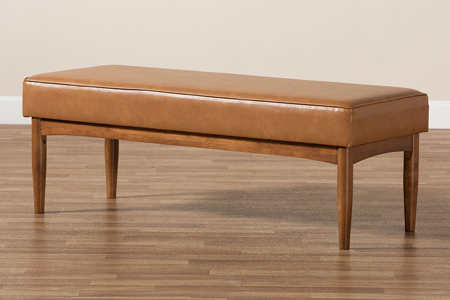 Baxton Studio Arvid Mid-Century Modern Tan Faux Leather Upholstered and Walnut Brown Finished Wood Dining Bench