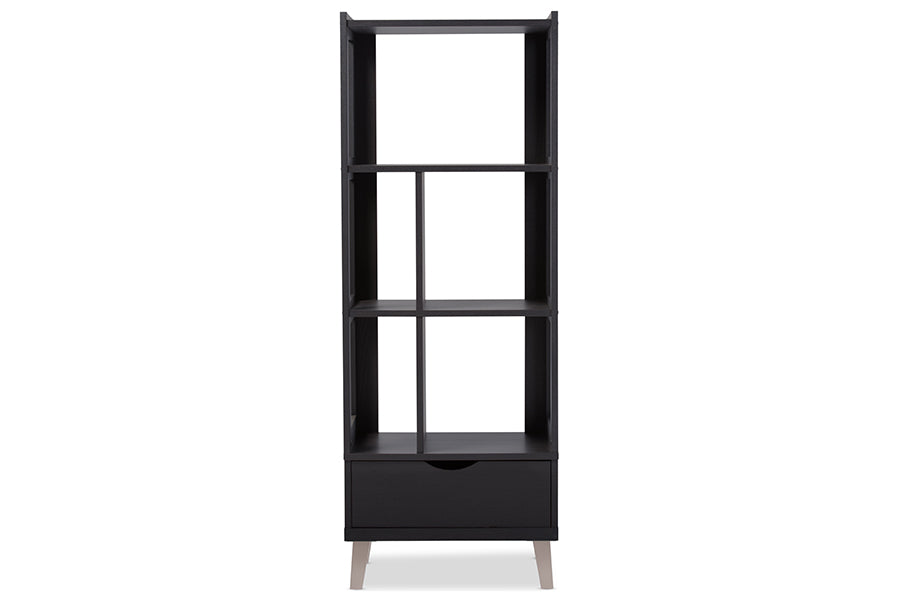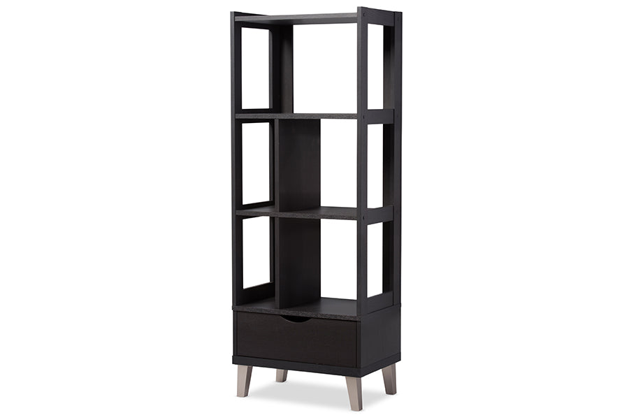 Baxton Studio Kalien Modern and Contemporary Dark Brown Wood Leaning Bookcase with Display Shelves and One Drawer