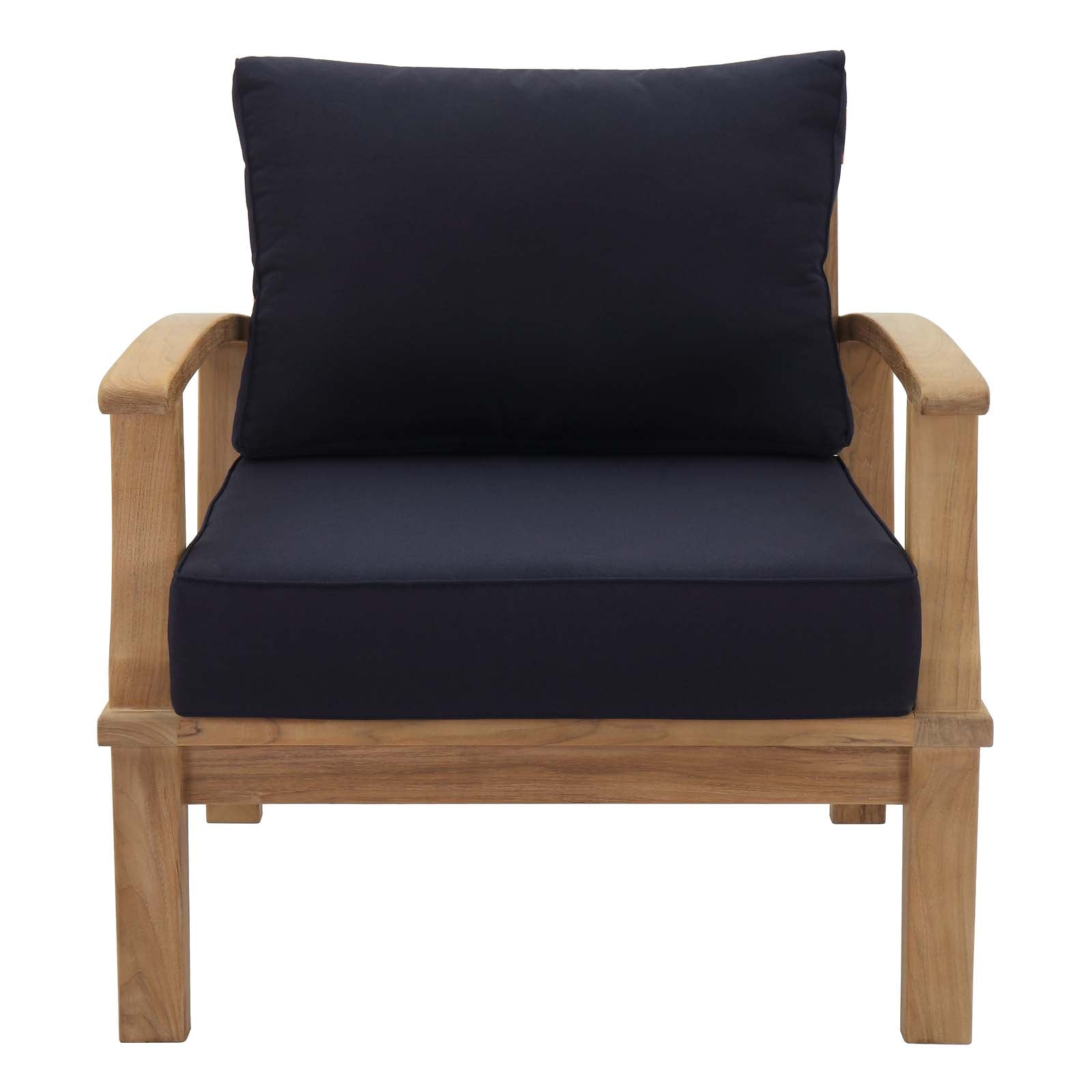 Harbor your greatest expectations with the luxurious Marina Teak Wood Outdoor Patio Arm Chair. Marina Patio Arm Chair has a seating arrangement perfect for every member of your crew as you breathe the fresh, crisp air of a day spent with friends and family. Known for its natural ability to withstand extreme weather conditions, teak is the wood selection of choice for long-lasting outdoor patio furniture. Now you can enjoy Marina Teak Wood Outdoor Arm Chair with its durable construction and all-weather cushions. Assembly required. Please note that while the covers on your new outdoor set are composed of strongly water-repellent material, if left out in the rain or within the range of sprinklers, they will absorb moisture through the seams. We suggest covering or storing your new cushions indoors when not in use. If the cushions do get wet, stand them on their sides to allow the water to drain out. For cleaning, use only mild dish soap and water, never use harsh chemicals. Set Includes: One - Marina Outdoor Patio Teak Armchair