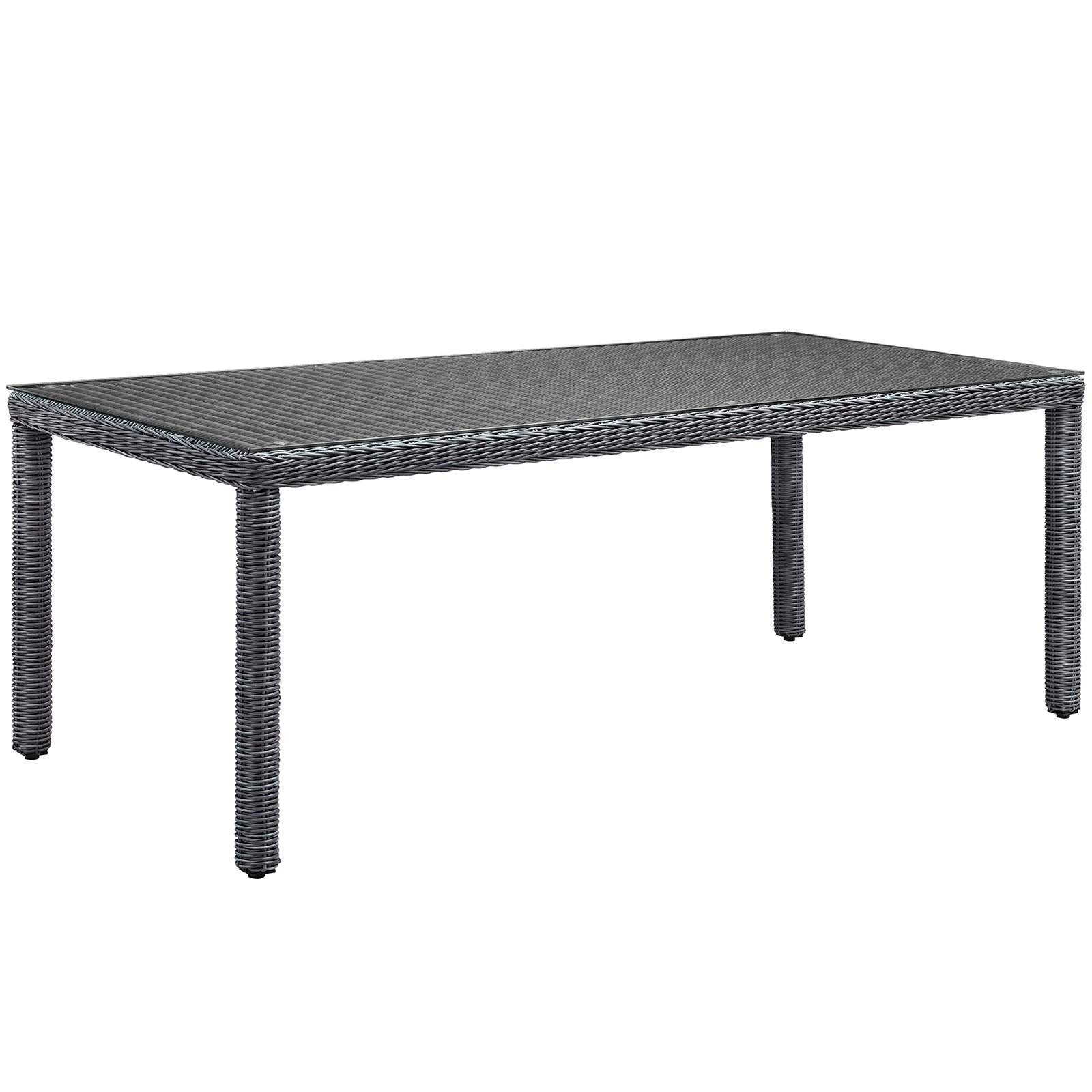 Experience the outdoors with exceptional comfort and quality. Summon Outdoor Patio Dining Table Set offers an exquisite two-tone synthetic rattan weave, plush all-weather cushions with industry-leading Sunbrella fabric, UV protection, and a sturdy powder-coated aluminum frame. Featuring rounded arms and an elegant modern look, Summon Outdoor Dining Furniture set is part of an avant-garde outdoor sectional series well-equipped for enhancing patio, backyard, or poolside gatherings. This installment of the series is an Outdoor Patio Dining Table and Armchair Set. Set Includes: Eight - Summon Dining Armchair One - Summon Dining Table
