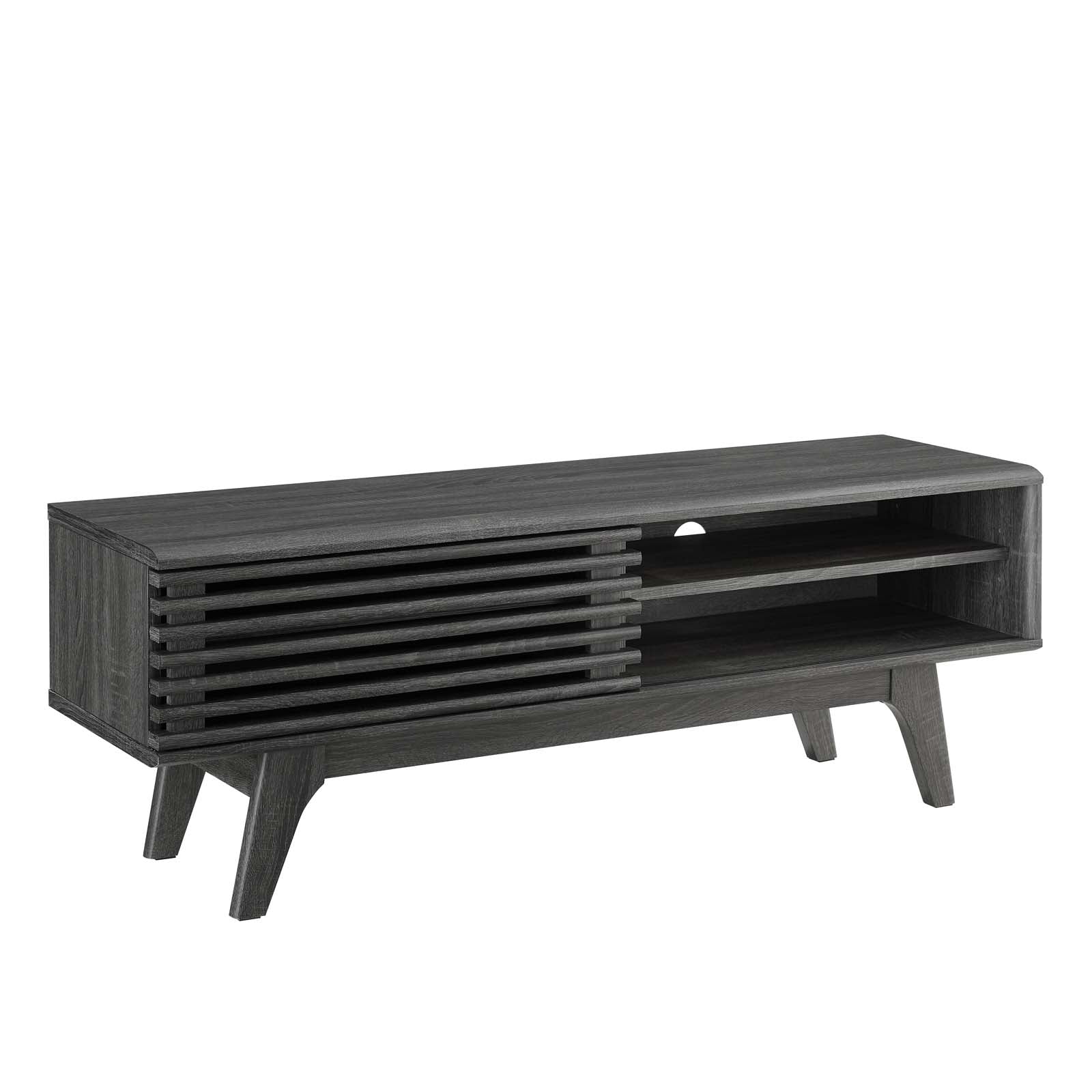 Tap into mid-century aesthetics with the Render 48” TV Stand. Render features smooth walnut grain veneer, four solid wood tapered legs, non-marking foam foot pads, and a slatted sliding door for sophisticated media storage. Complete with cable management holes on both sides, Render’s contemporary linear style is the perfect addition to the modern living room, lounge, or recreation area. Set Includes: One - Render 48” TV Stand